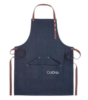 Adjustable kitchen apron with 3 front pockets in 240 gr/m² denim with cotton straps. Presented in individual box. Size 63x83 cm Print technique Screen printing,T1,TD,E,DL