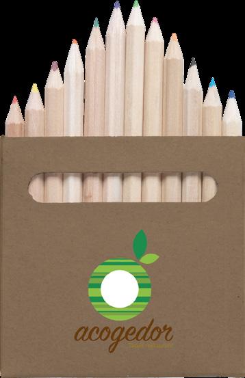 12 crayons de couleur non vernis en bois, dans une boîte en carton recyclé. Dim. 9 x 9 x 0,9 cm. 30 g.