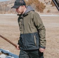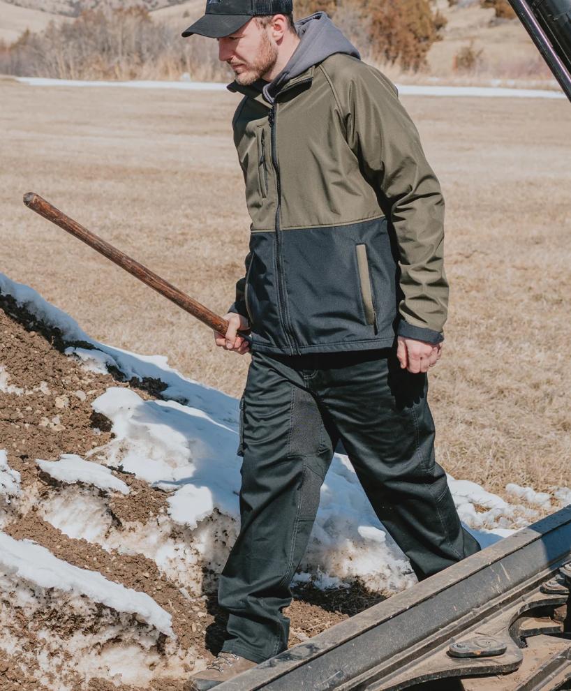 Features a bold olive and black contrast that stays looking sharp even in dusty environments. Material- High-density polyester windbreaker shell. Closure- Heavy duty front zipper. Two side hand-warmer pockets