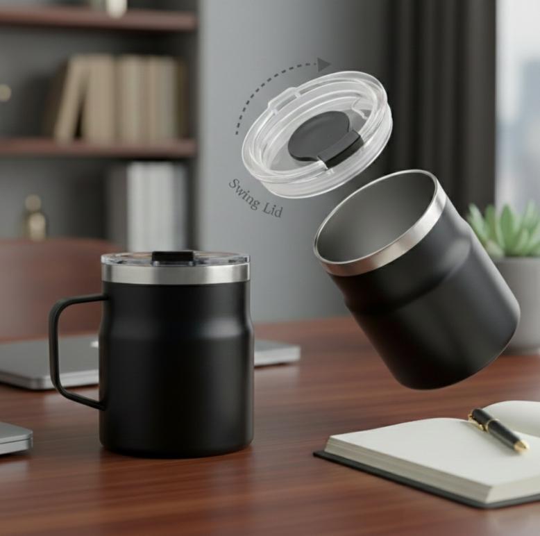 Elevate your daily ritual with this sophisticated black THERMO mug. Designed for both style and practicality, it's your new go-to for on-the-go beverages. Imagine enjoying your favorite drink, perfectly preserved at the ideal temperature, whether you're conquering your workday or exploring the outdoors. The ergonomic handle and secure swing lid make it the ideal travel companion, seamlessly fiing into your life