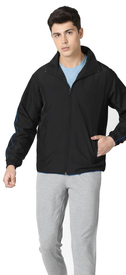 100% polyester jersey bonded with 100% polyester microfleece . center front reversed coil zipper with semi-autolock pull tab self -fabric banded cus and waistband. front zippered pockets. Lower pockets with contrast Reverse coil zippers.