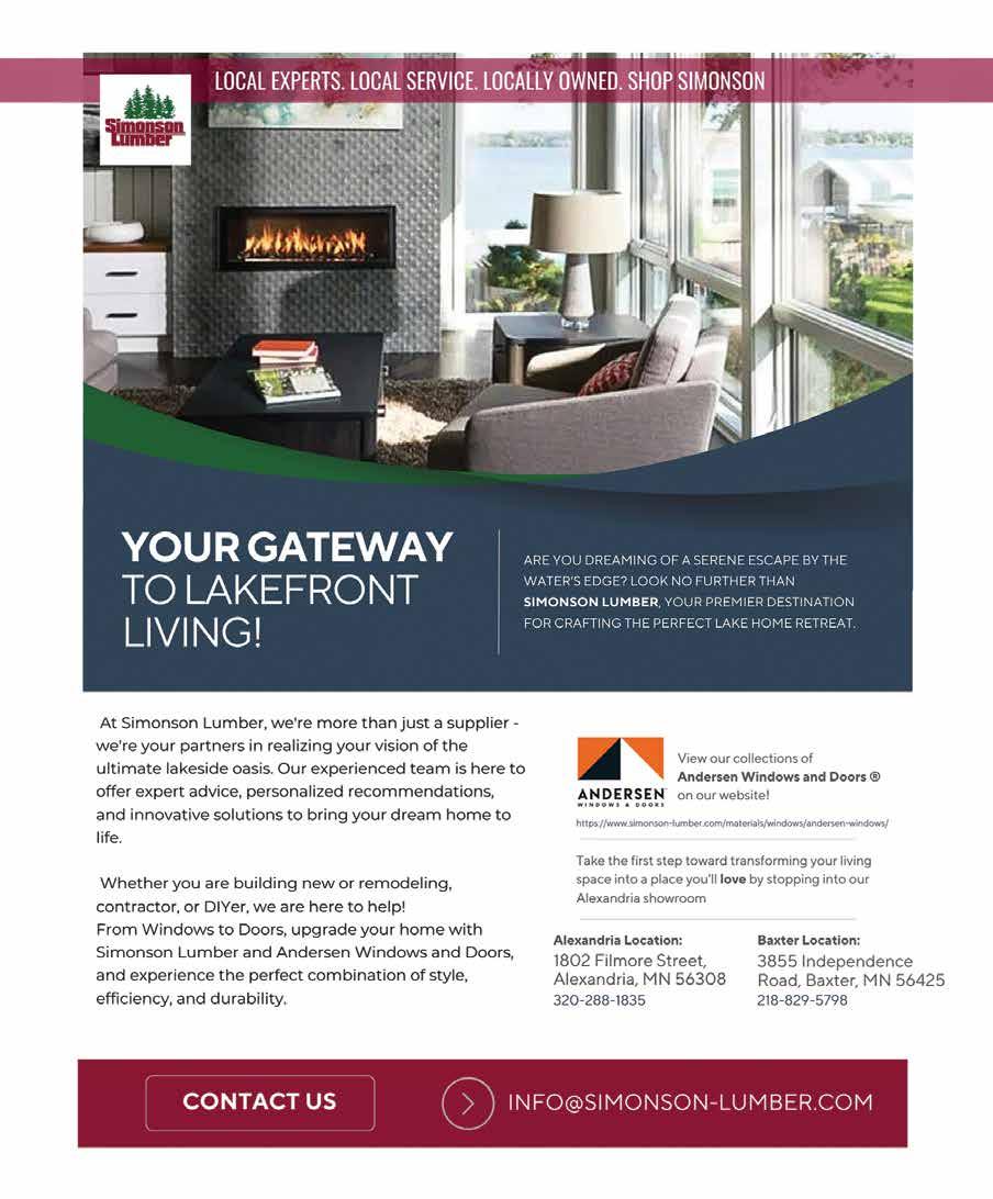 We are in peak season at the lake and it’s Minnesota living at its very finest as we celebrate the Fourth of July, gather with friends and family, and enjoy the many outdoor activities our region offers. This issue, we are focused on enjoying the waterfront and are bringing you a few new twists!