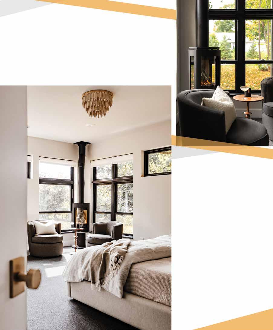 Windows invite the lake in at every turn. From the sauna hallway, you walk through a pocket door into the foyer. The main floor master suite offers varied views of the landscape. A freestanding Jøtul gas stove from Home & Hearth in Fargo, ND is nestled between a pair of barrel chairs in the bedroom, the perfect place for a tete a tete.