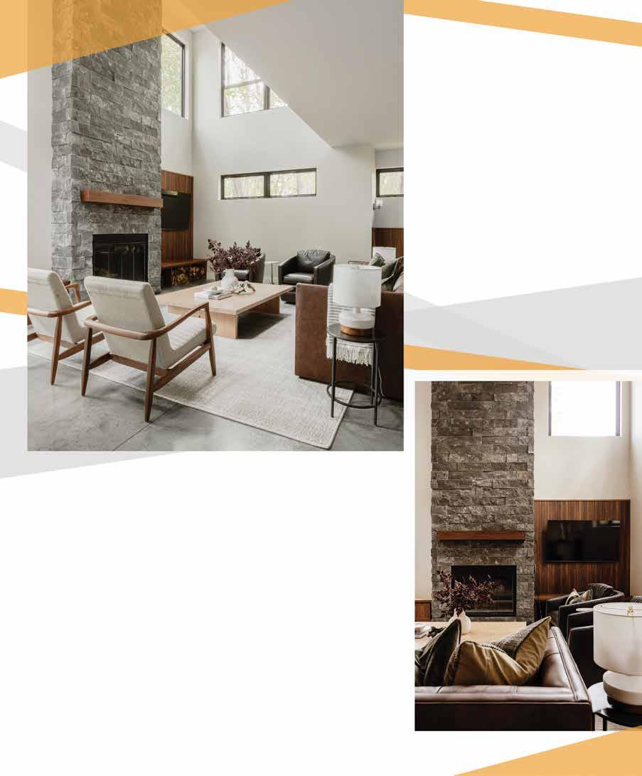 A stately wood burning fireplace anchors the room. The couple was looking for unconventional fireplace stone, but the search proved elusive. Lisa finally found and tracked down the perfect option after seeing it in, of all things, a Marvin Windows ad.