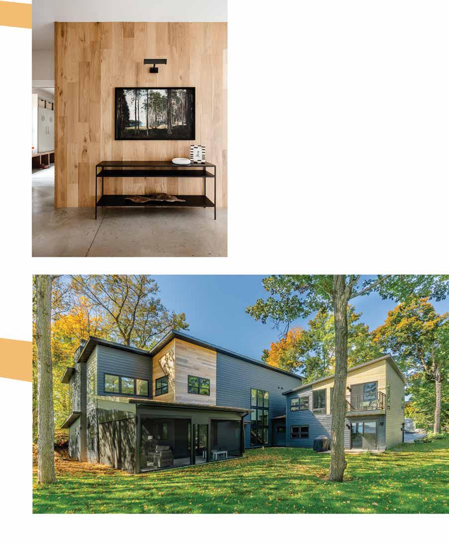 Warm wood accents sing against dark siding installed by MS Construction. Guests enter through the front door or the garage. The latter passes through a mudroom featuring built-in lockers (constructed by the Woodshop of Avon) that maximize storage and reduce visual clutter. The company also handled all of the cabinetry in the home, including distinctive accents like built-in bench seating in the great room and front entry.
