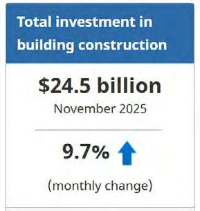 January 21, 2026— The total value of investment in building construction increased 9.7% to $24.5 billion in November. This increase partly stems from October’s rise of 14.9% in the total value of building permits, reflecting a lag in converting permit issuance into onsite construction investment. The residential sector rose 13.3% in November, and the nonresidential sector was up 1.4%. Year over year, investment in building construction grew 16.6% in November. On a constant dollar basis (2023=100), the total value of investment in building construction rose 9.6% from the previous month to $22.7 billion in November and was up 13.0% year over year.