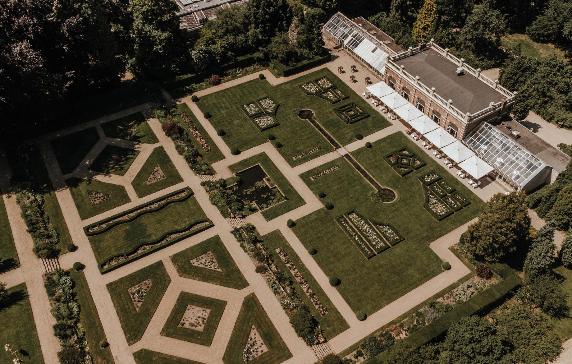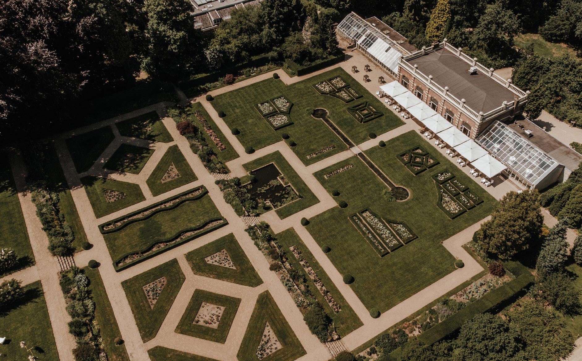 1 Orangerie Groot Warnsborn in Arnhem. Bij zo’n prachtige locatie met grote tuin is een foto van boven een mooie toevoeging, die ook een andere kijk geeft op je trouwlocatie.