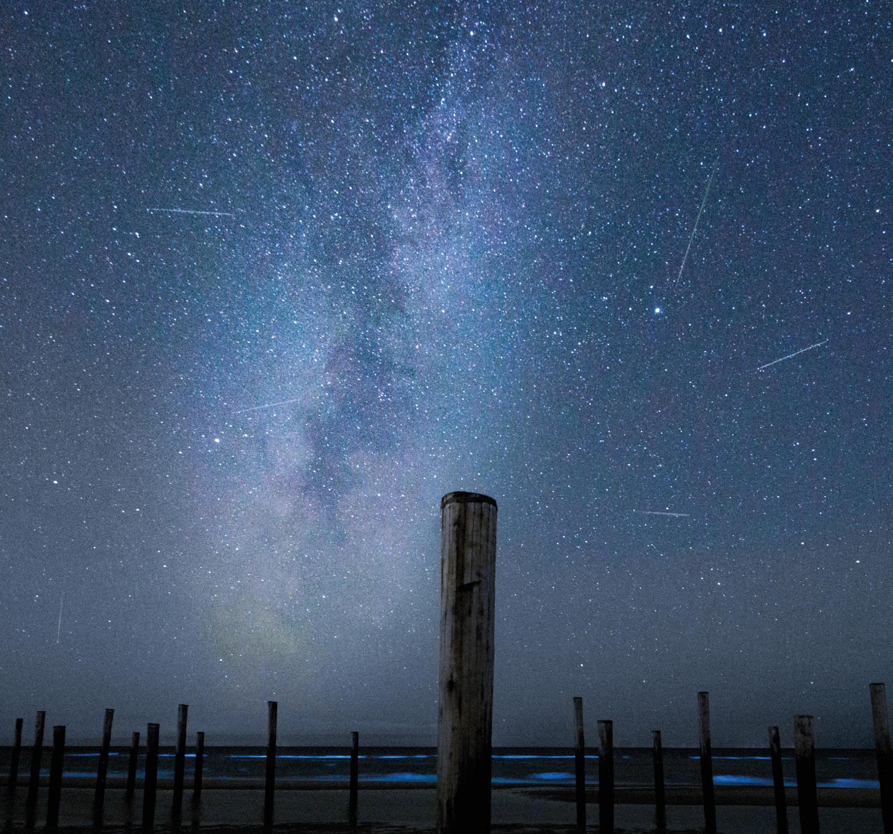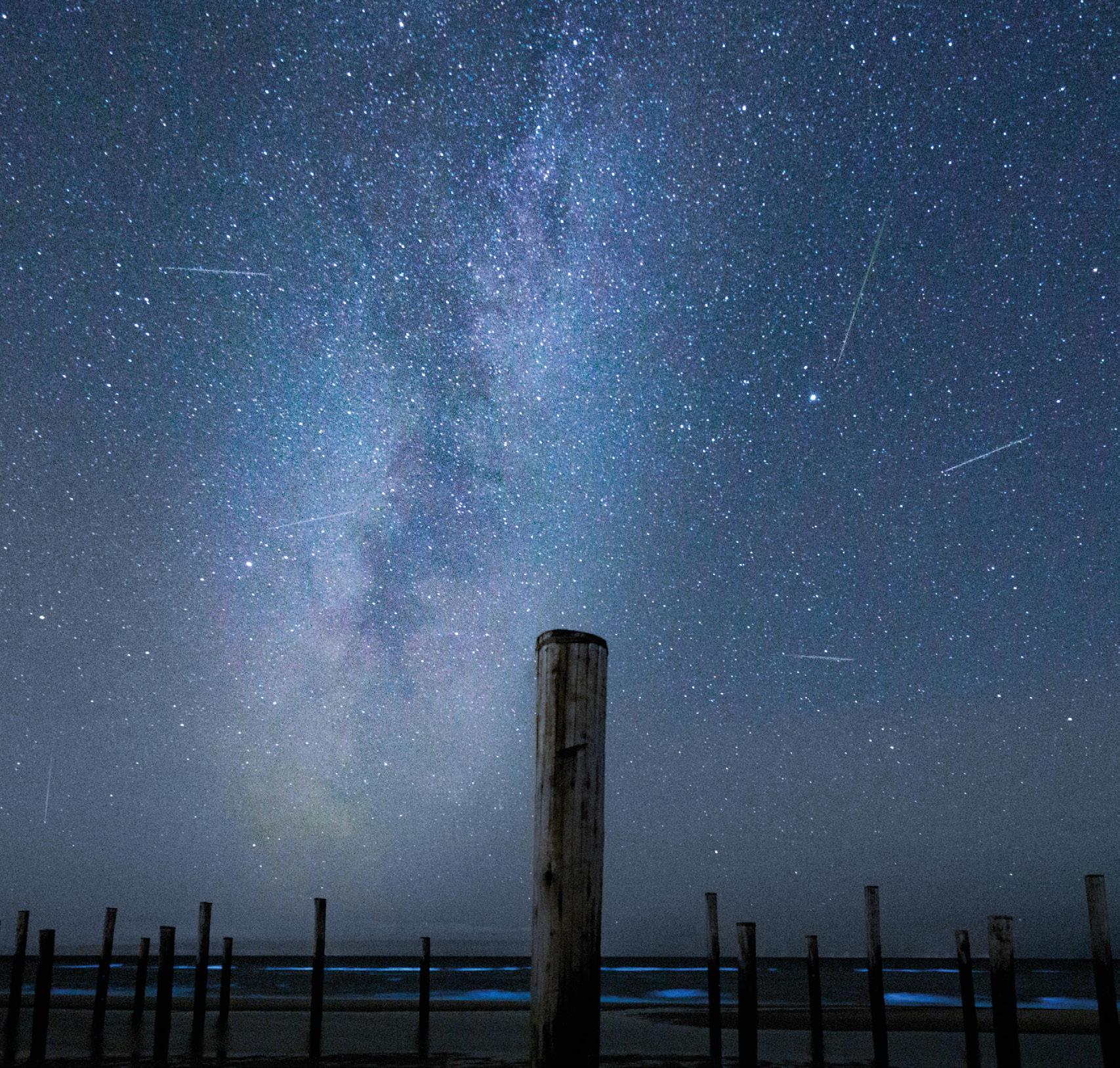 1 Drie natuurverschijnselen in één foto: de Perseïdenmeteorenzwerm, zeevonk én de Melkweg. En de fotograaf koos ook een interessante voorgrond door de paaltjes van Petten aan zee in beeld te brengen.