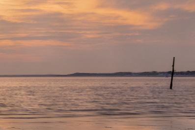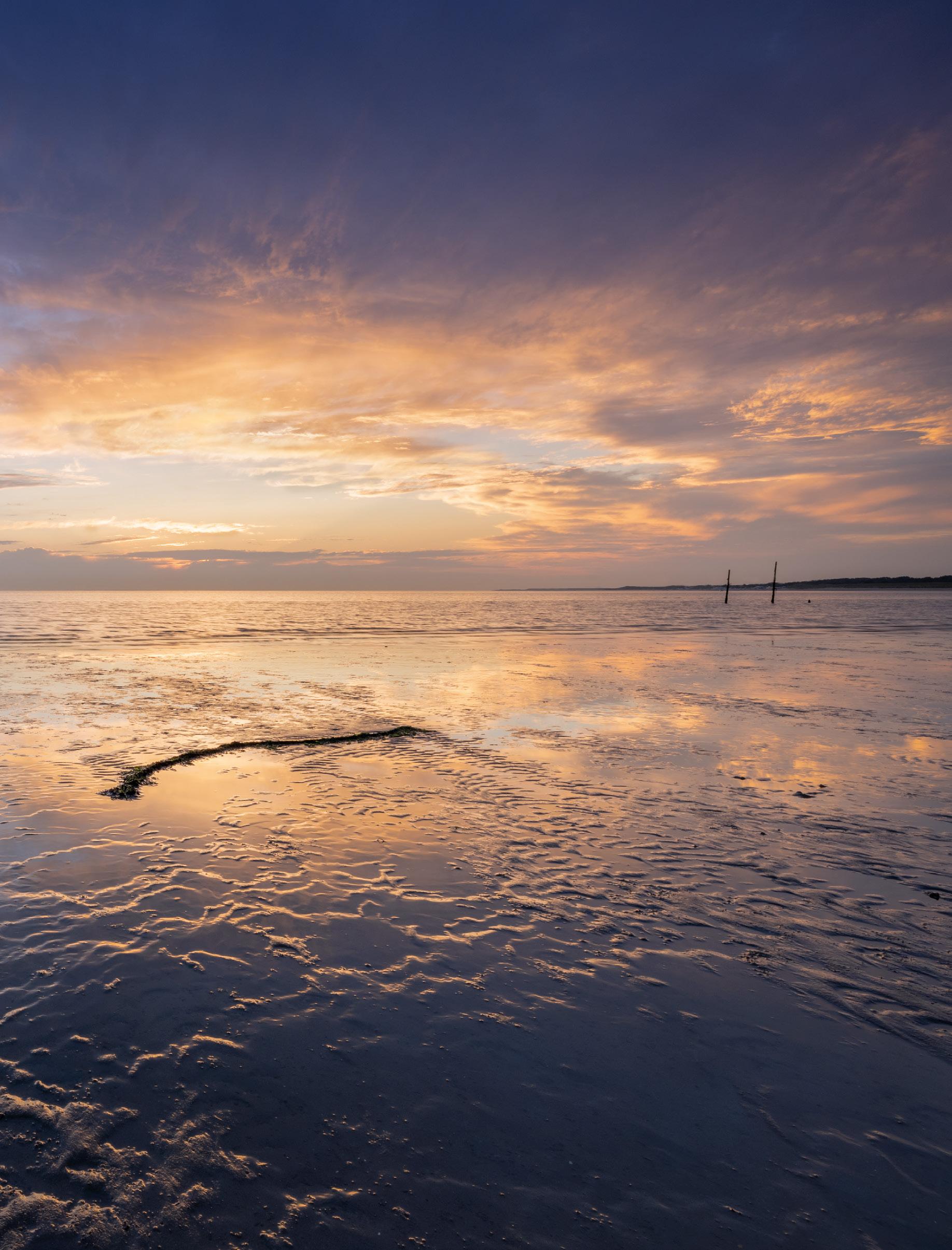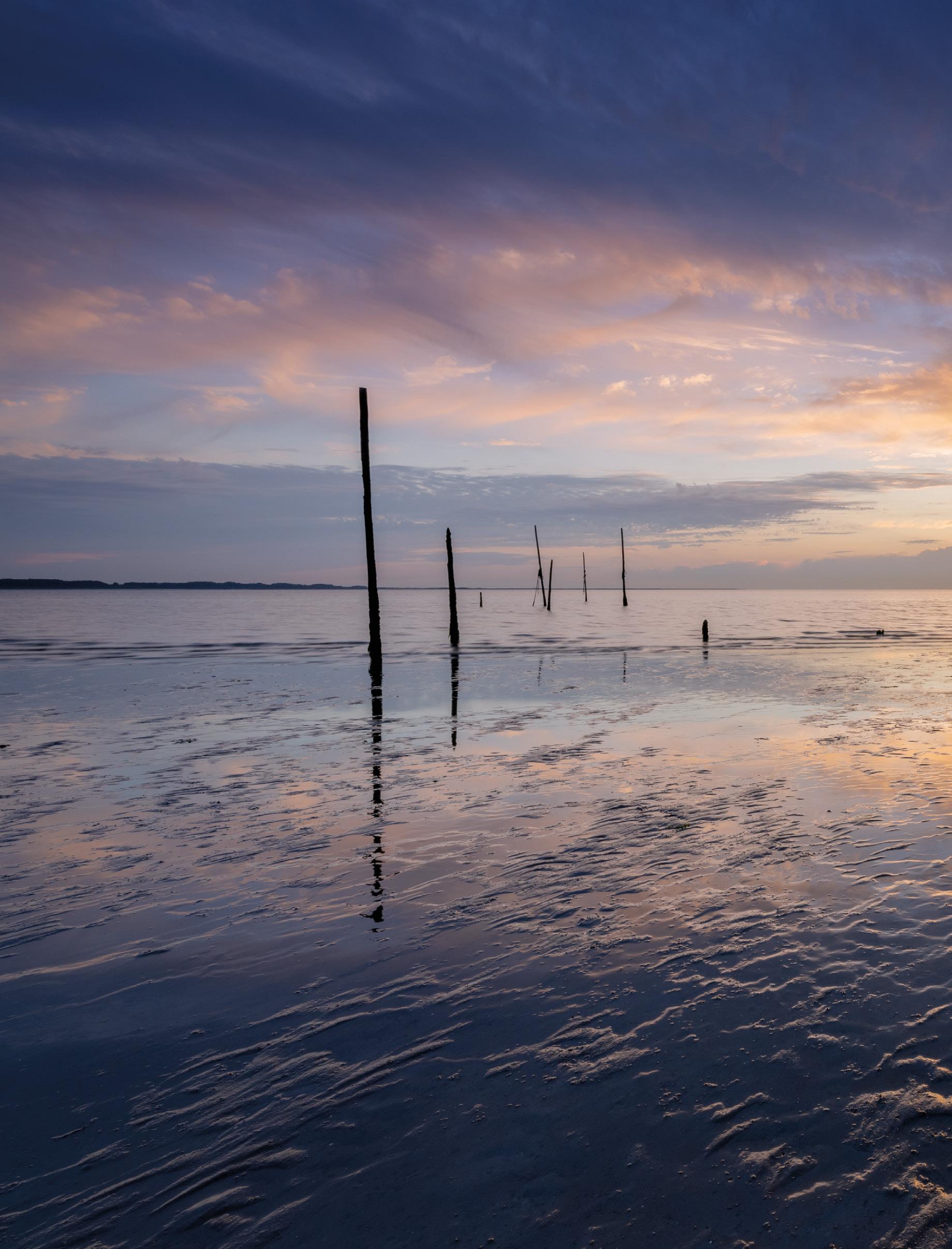 Hier koos Karin ervoor de horizon in het midden te houden, omdat de visstokken mooi gespiegeld werden in het zand. De stokken links en de strook zeewier rechts zorgen voor balans in de foto. Gemaakt met een 3-stops verloopfilter met zacht verloop.