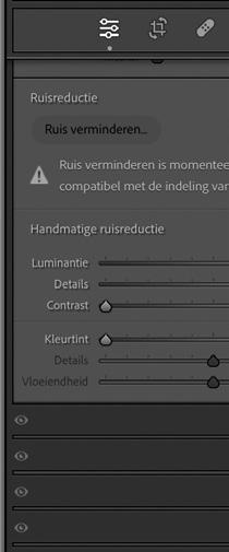 dan kies je voor Handmatige ruisreductie Het driehoekje achter die titel klik je open. Heb je een oudere versie van Lightroom of Lightroom Classic en heb je nog niet de recente updates doorgevoerd, dan heb je uitsluitend die handmatige manier tot je beschikking.