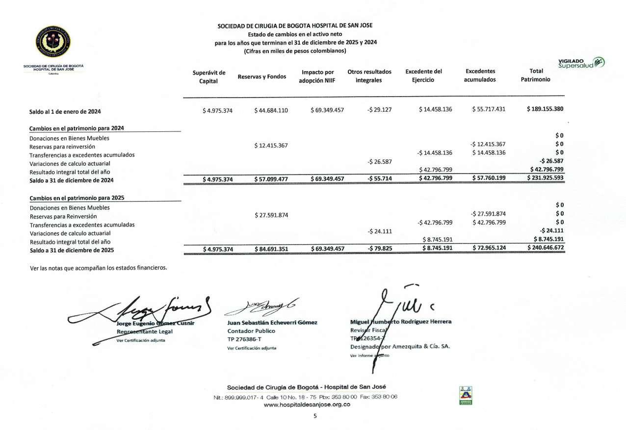 Hemos auditado los Estados Financieros Separados de la SOCIEDAD DE CIRUGÍA DE BOGOTÁ - HOSPITAL DE SAN JOSÉ, en adelante la Sociedad, que comprenden el Estado de Situación Financiera al 31 diciembre de 2025, y el Estado de Actividades, de Cambios en el Activo Neto y de Flujos de Efectivo, por el año terminado en esa fecha, así como un resumen de las políticas contables significativas y otra información explicativa.