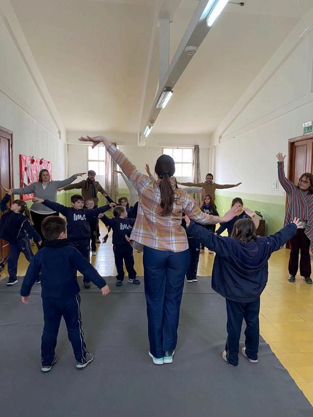 Abrimos las seis clases de la misma forma: en círculo para vernos entre todos y empezar a preparar el cuerpo para la actividad. Luego cada uno propone un movimiento cualquiera y los demás repetimos.