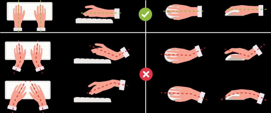 Al utilizar el teclado las manos deben formar una línea recta, como prolongaciones de los brazos. En ningún caso deben formar un ángulo ni torcerse. Sujete el ratón con toda la mano, y mantenga una línea recta. Imagine el ratón como si fuera una “prolongación natural” de su mano. En ningún caso tuerza la mano. Cuanto más cerca esté el ratón de la mano, más natural es la postura.
