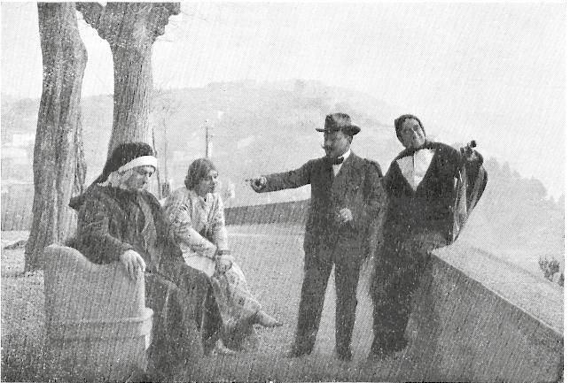 Cesare Gani Carini, Fernanda Negri Pouget, Mario Caserini e Antonio Grisanti in una pausa della lavorazione di Dante e Beatrice, Società Anonima Ambrosio, 1913.