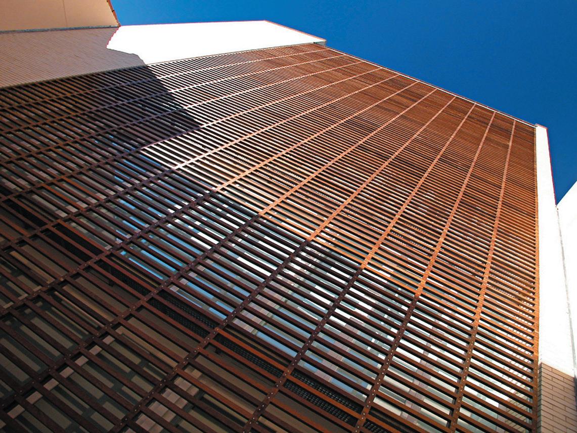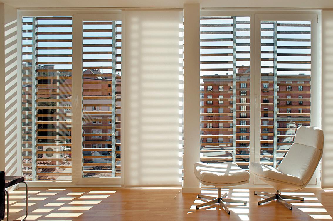La fachada que da a la calle, de menor incidencia solar y donde la mayoría de estancias son dormitorios, dispone de un ritmo de aperturas regulares protegidas por porticones exteriores, permitiendo controlar privacidad y oscurecimiento interior, mientras que la fachada suroeste es permeable, con grandes balcones para las estancias y toldos retráctiles de protección solar que son regulados tanto de forma individual como centralizada.