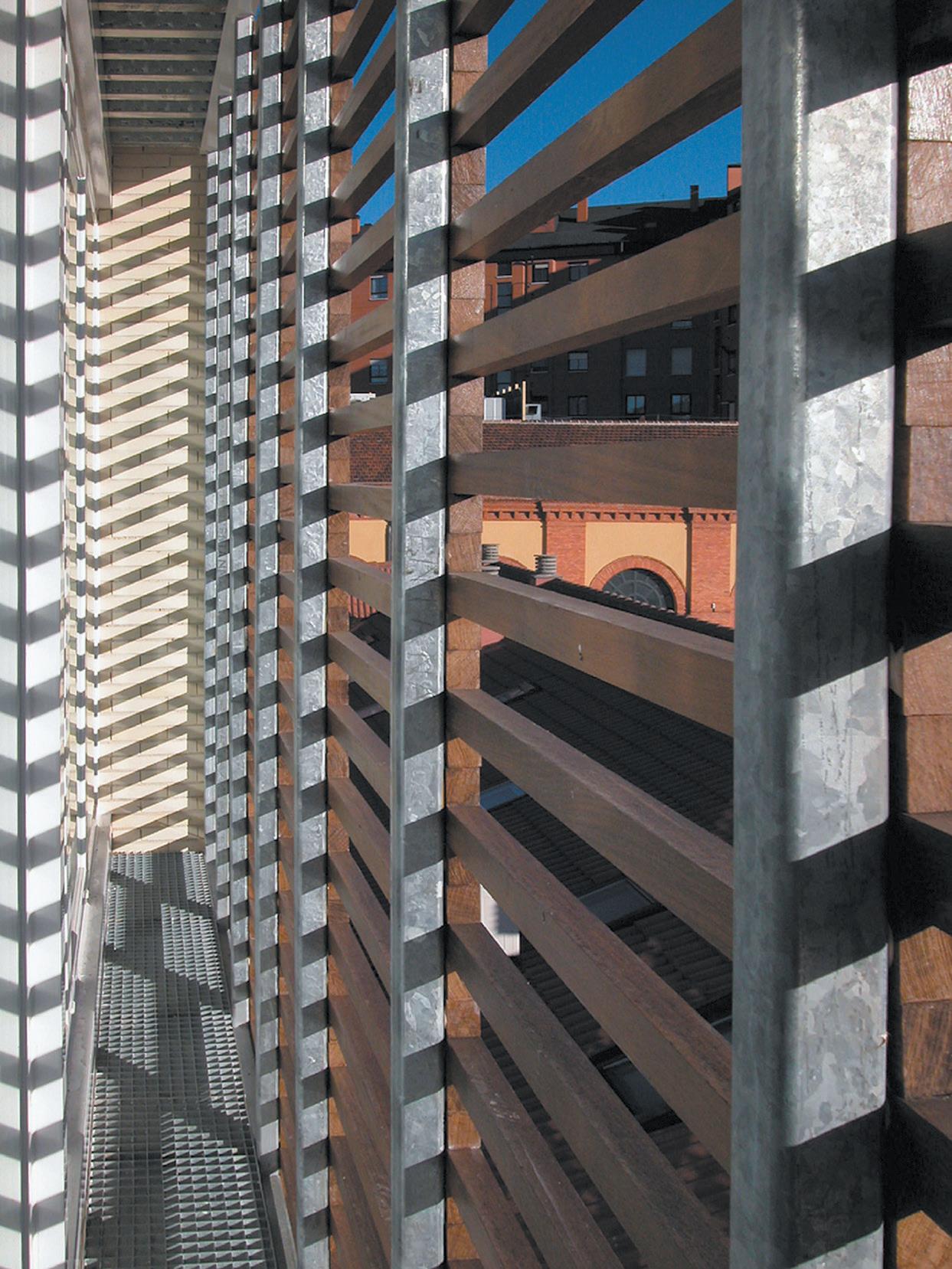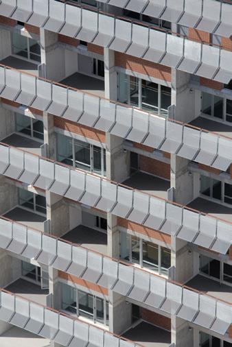 Las barandillas adquieren una mayor dimensión para reforzar la percepción en el ritmo de crecimiento de la torre y sirven como viseras que tamizan el sol. El uso público de los espacios y el destino de las viviendas para alquiler joven permiten dotar a todo el conjunto de un carácter abierto y dinámico.