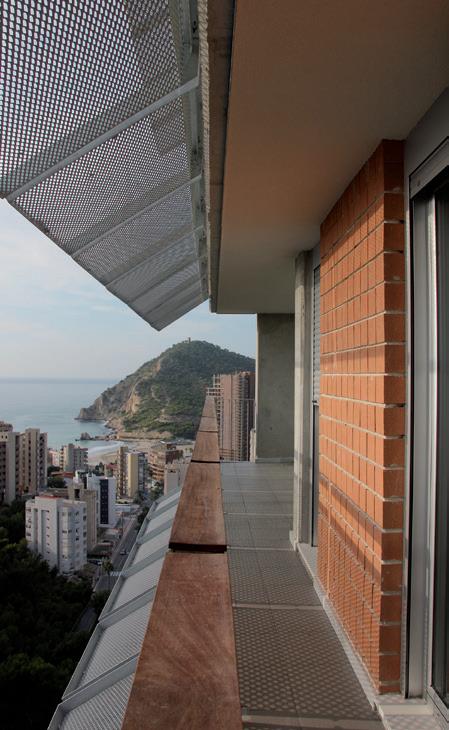 This building came about after its architects won first prize at the Fifth Preliminary Design Awards organised by IVVSA. Benidorm has two features that this project aimed to exploit: the possibility to have sea views and a town layout that favours high-rise buildings. However, the uneven ground of the plot on which it is located was a restricting factor: it is only from the ninth floor that the Mediterranean Sea can be seen. The building is therefore divided into two natural parts: the first eight floors house duplexes with double-height terraces, with the different rooms looking onto these. These air occlusions allowed us to expand the building and to make the most of the space available for building on the upper floors. From the ninth floor (inclusive), the housing units are developed on one level, thus enabling us to construct a larger number of homes with distant views of the sea.