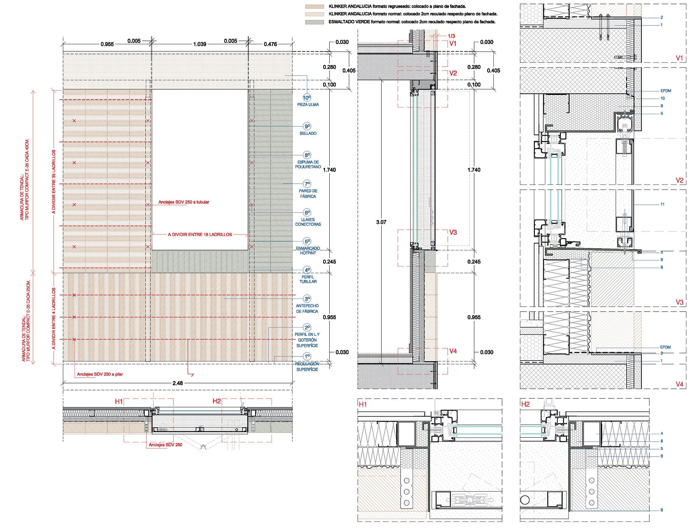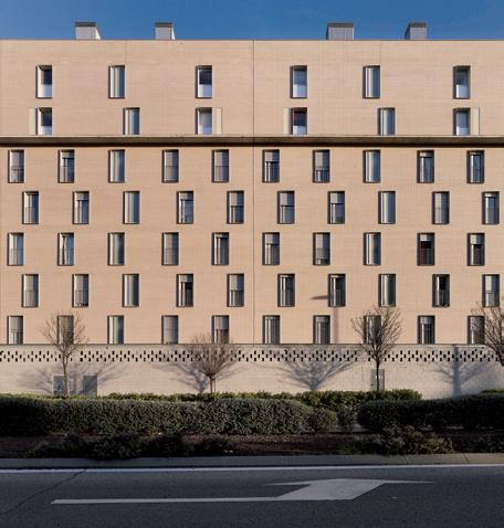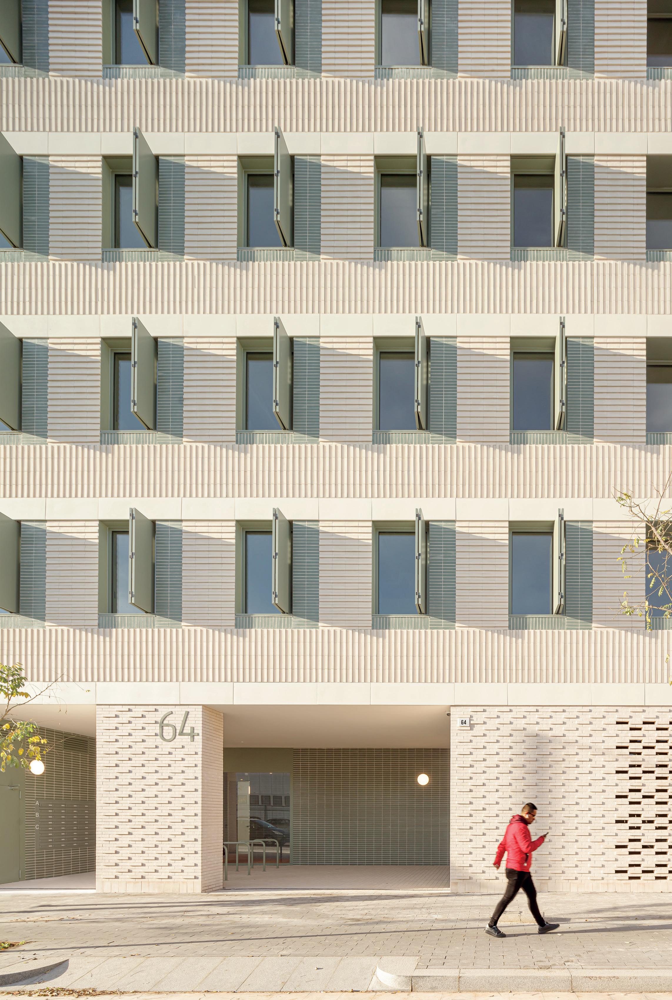 The façade follows a durable, efficient and lowmaintenance construction solution, while using a material recognizable in the surrounding industrial buildings. The masonry is the main element, with which reliefs, textures, rigging and lattices are created, introducing color as a simple strategy to make the whole building more friendly. The facade facing the street, with less sunlight and where most of the rooms are bedrooms, has a rhythm of repetitive openings protected by exterior shutters, allowing to control privacy and interior shading, while the southwest facade is permeable, with large balconies for the rooms and retractable sun protection awnings that are regulated both separately and centrally.