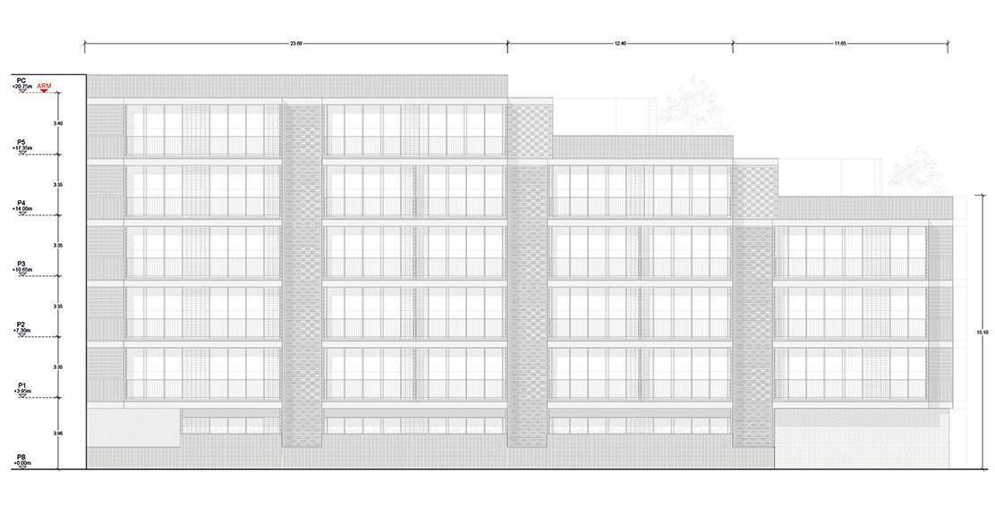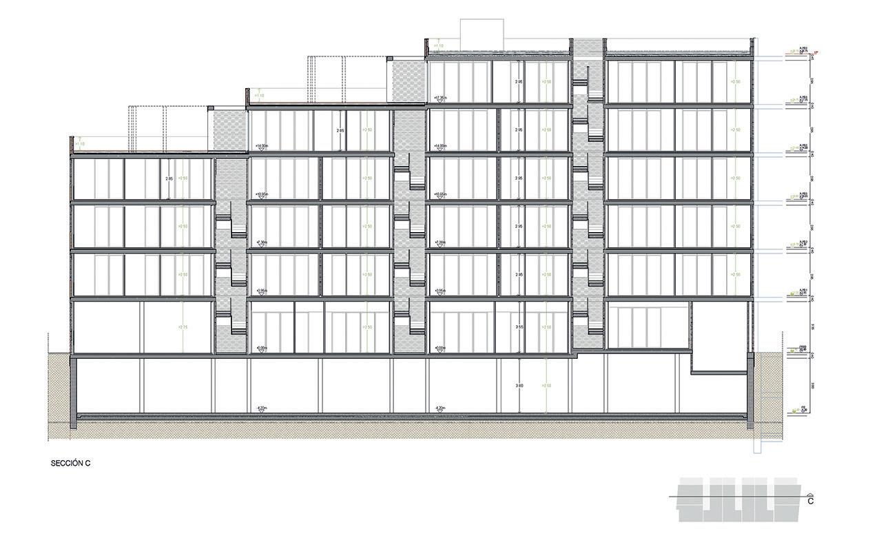 La normativa permite planta baja, mas seis y ático retranqueado. Se renuncia a realizar las viviendas en planta baja para mejorar la calidad de los espacios comunes en esta. Las viviendas se desarrollan en todas sus crujías en las siguientes siete plantas.