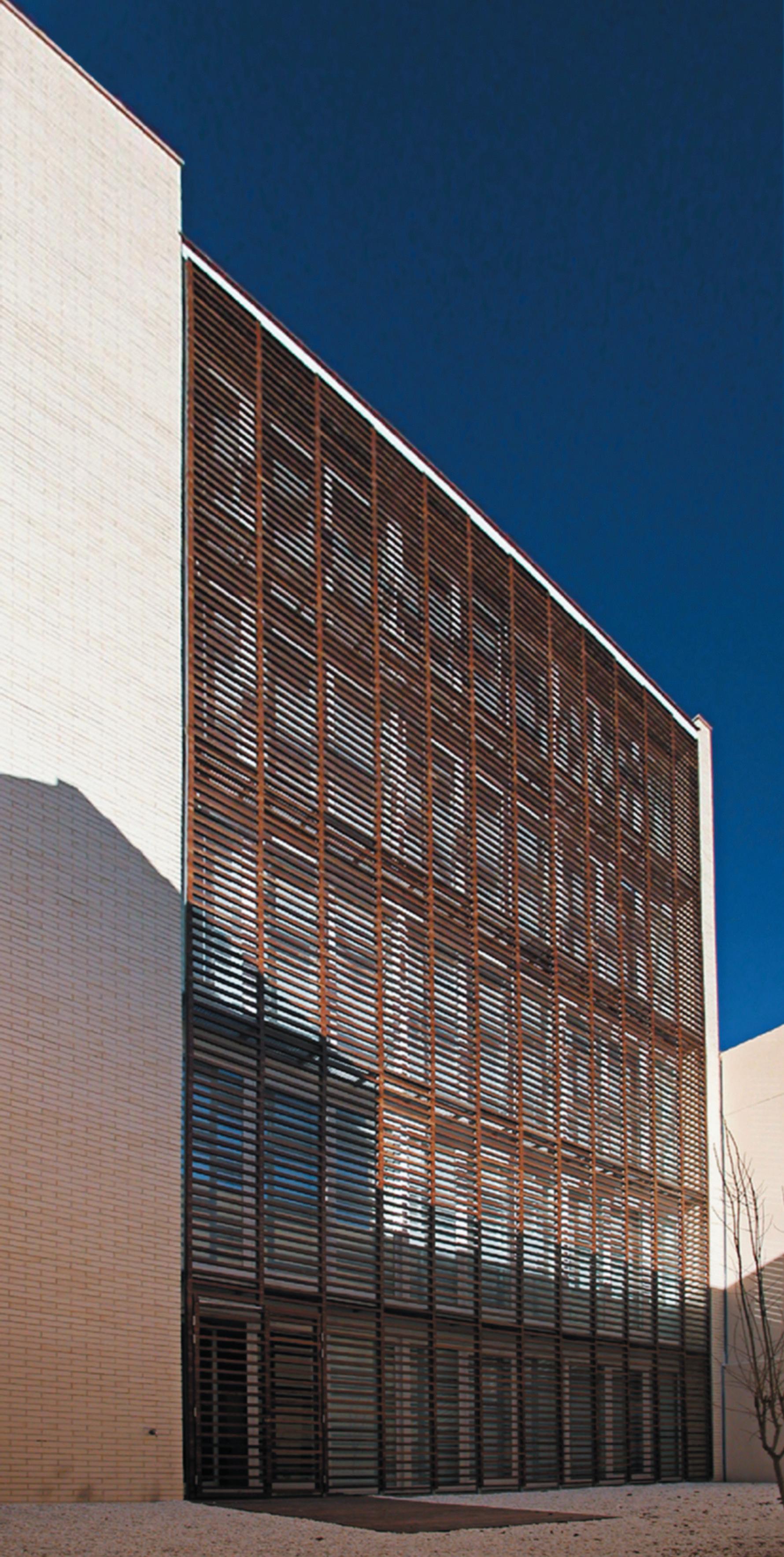 El edificio queda definido a través de la estructura de hormigón en base a una retícula confinada entre los dos testeros laterales, las cajas de ascensores y la doble escalera exterior. Las fachadas se resuelven como relleno de este esqueleto estructural con un cerramiento de bloque cerámico.