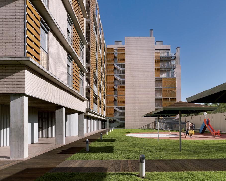 The project was carried out in two phases. The first consisted of 160 apartments accessed via 10 entrances. The housing models, which are repeated on each floor, have a double façade to facilitate ventilation, the same centreline width and slight variations in length in order to fit the dimensions of the plot. They consist of 2 and 3-bedroom apartments, except for the ones on the corner and on the two top floors, which are onebedroom. The living rooms are located beside the kitchen and are south facing. All of the floors are identical from the first to the fifth floor, except for three of the blocks, where the windows vary and which have a terrace on the first floor.