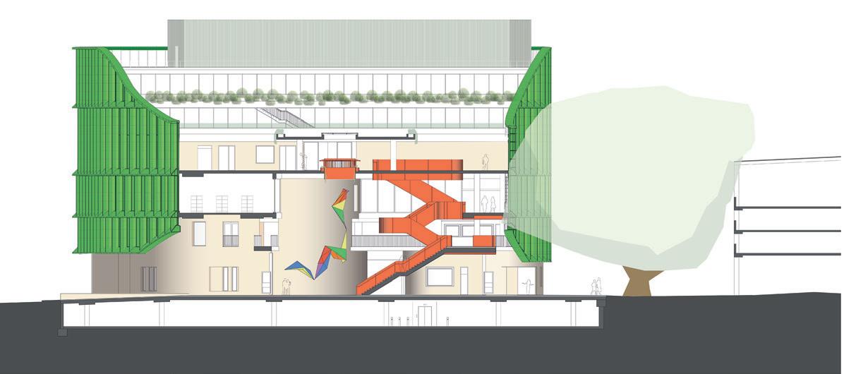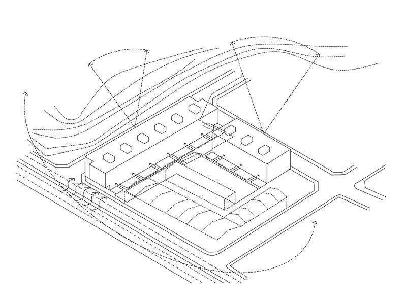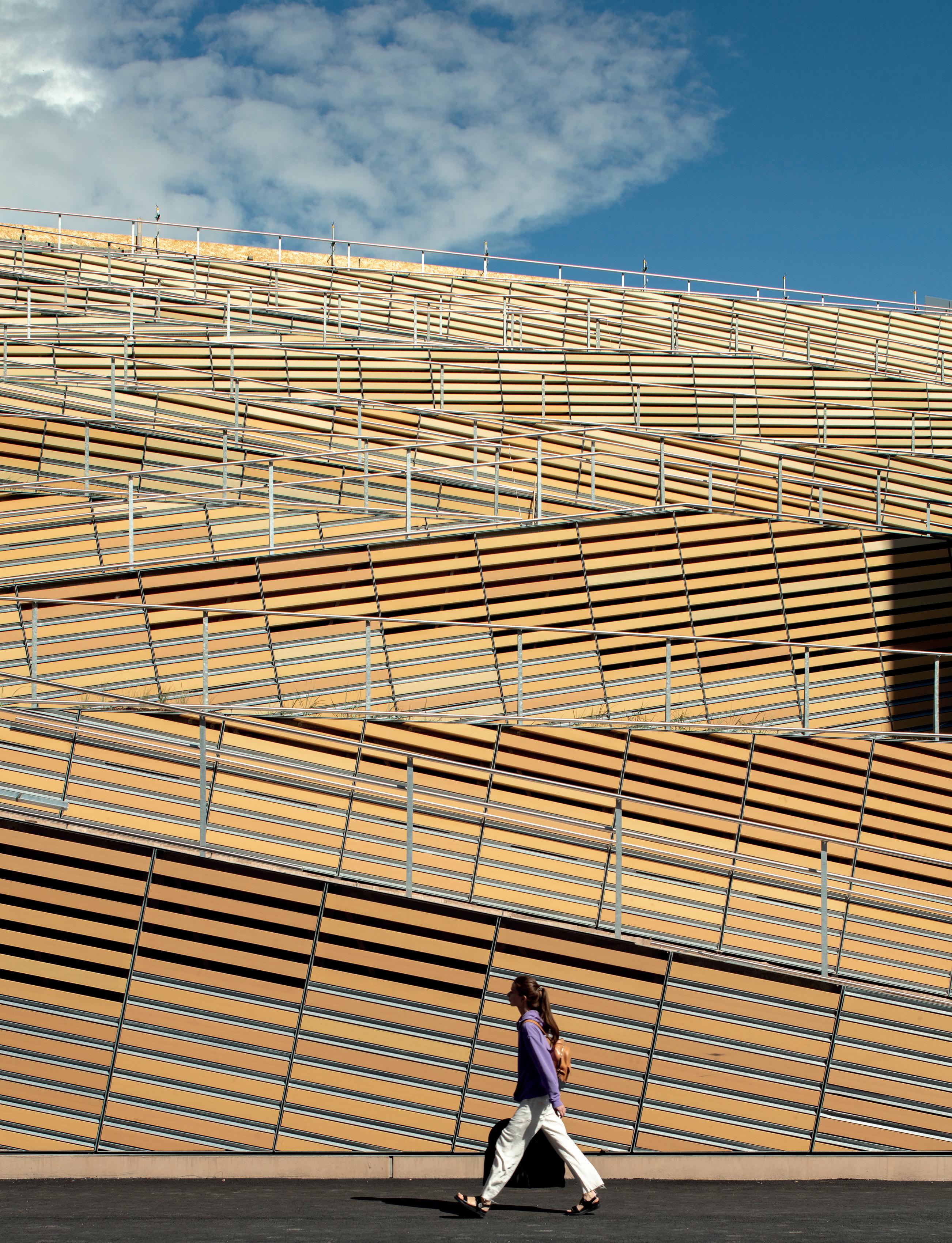 Revistiendo una estructura portante de hormigón in situ, las fachadas son elementos prefabricados de grandes perfiles huecos de terracota en marcos de acero galvanizado. Texturas y colores rememoran la antigua geografía del lugar.