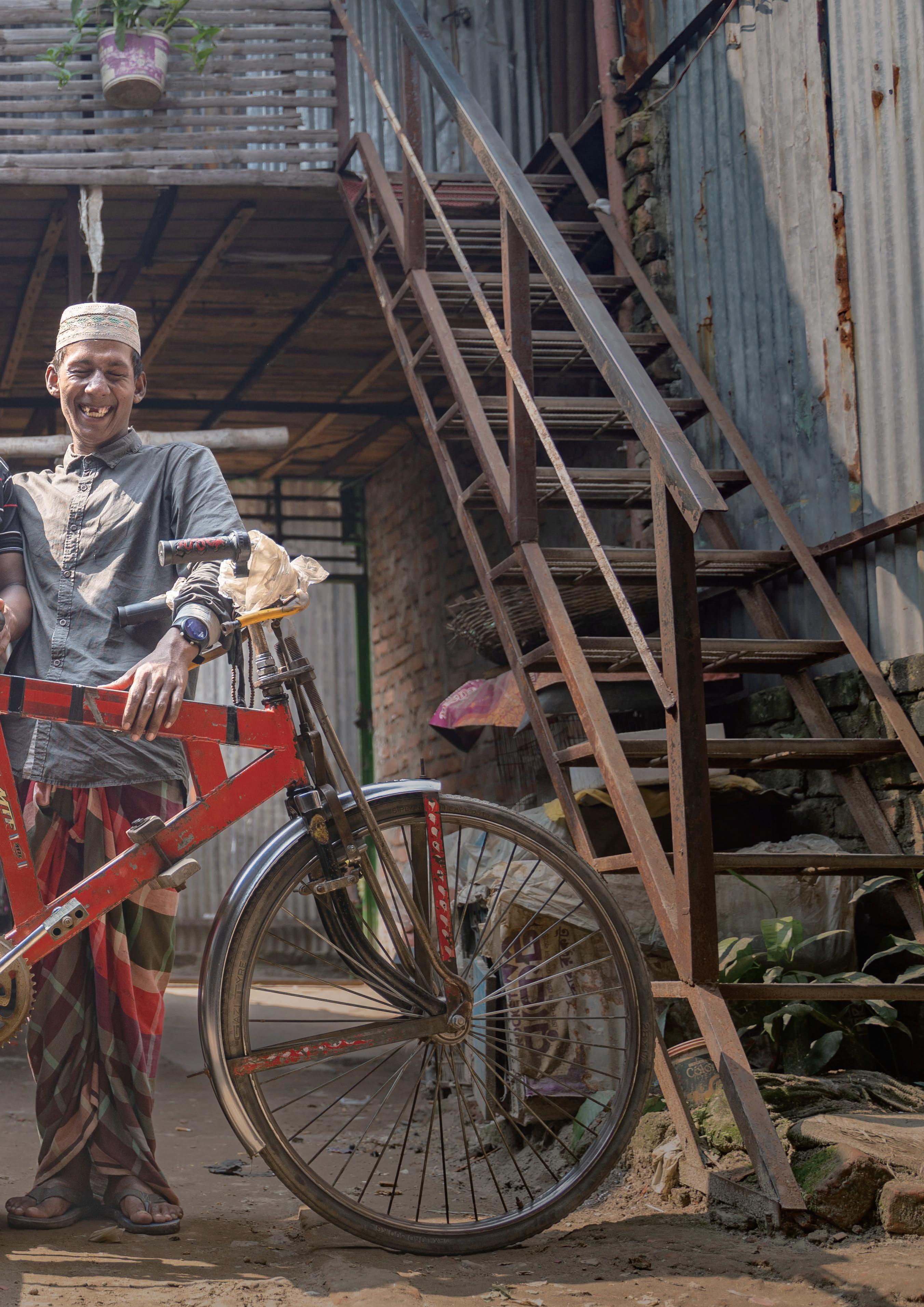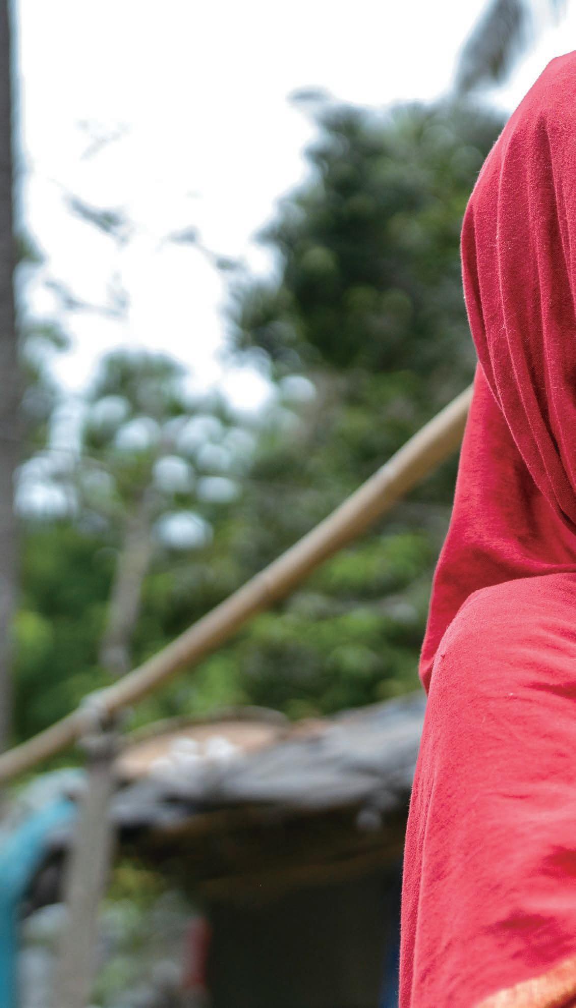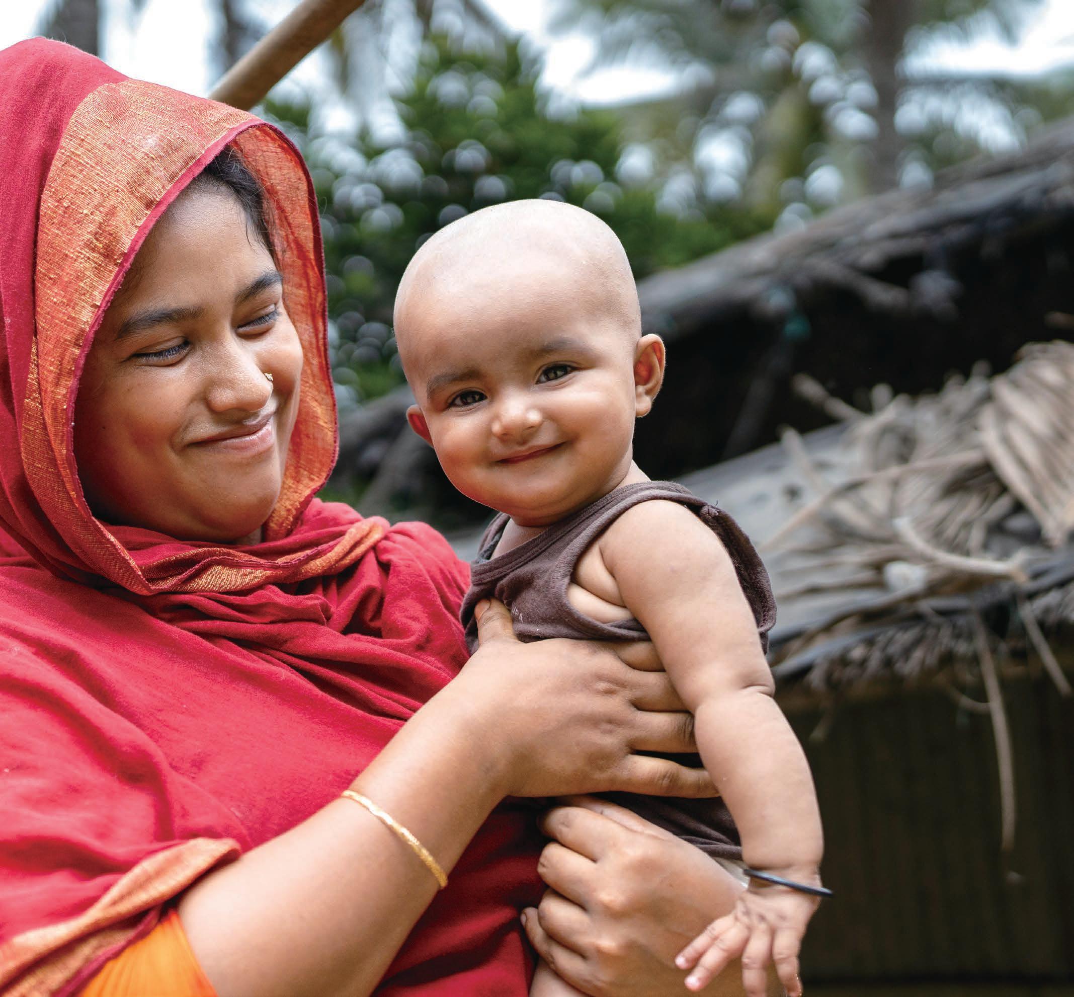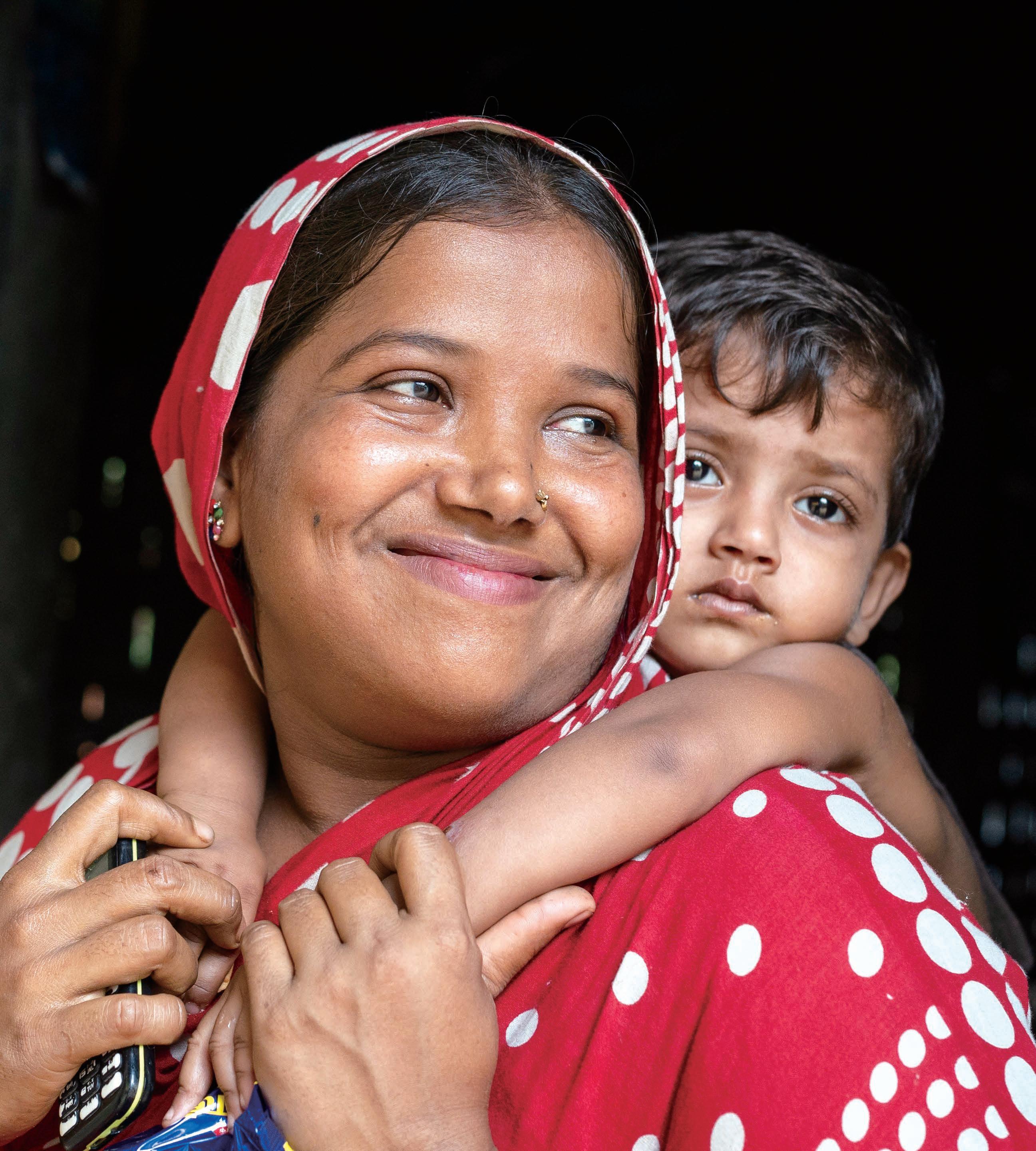 방글라데시 콕스바자르에 사는 루크사나 베굼 님이 두 살된 딸을 업고 미소를 짓고 있습니다. 루크사나 님은 컨선월드와이드의 지원으로 생계와 영양 개선을 위한