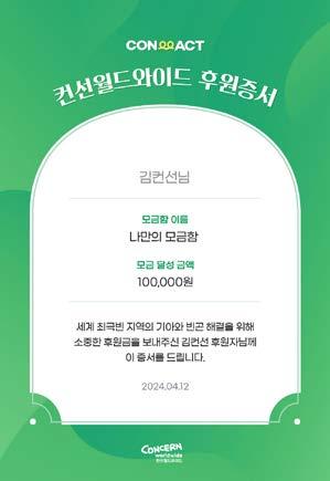 컨액트(CONACT) 캠페인은 컨선(CONCERN)의 ‘CON’과 행동하다는 뜻의 ‘ACT’가 결합된 이름으로, 누구나 직접 모금함을 만들어 기부에 동참할 수 있는 참여형 모금 캠페인입니다. 개설한 모금함을 통해 모인 후원금 전액은 극빈과 기아 종식을 위한 활동에 사용됩니다.