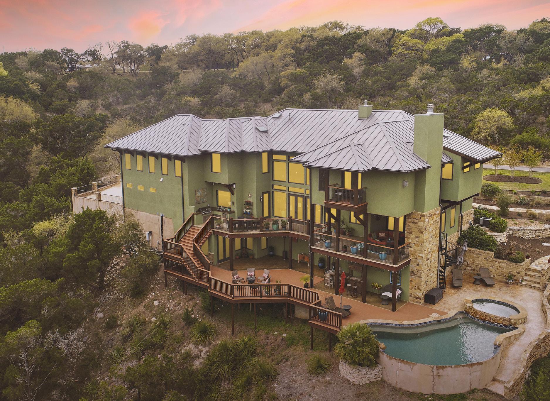 Two exquisite homes on dramatic view acreage create an unparalleled resortstyle compound overlooking Wimberley Valley. This remarkable 4.43-acre estate spans over 8,300 square feet with nine bedrooms, pool, spa, and covered outdoor entertaining areas with spectacular Hill Country views.