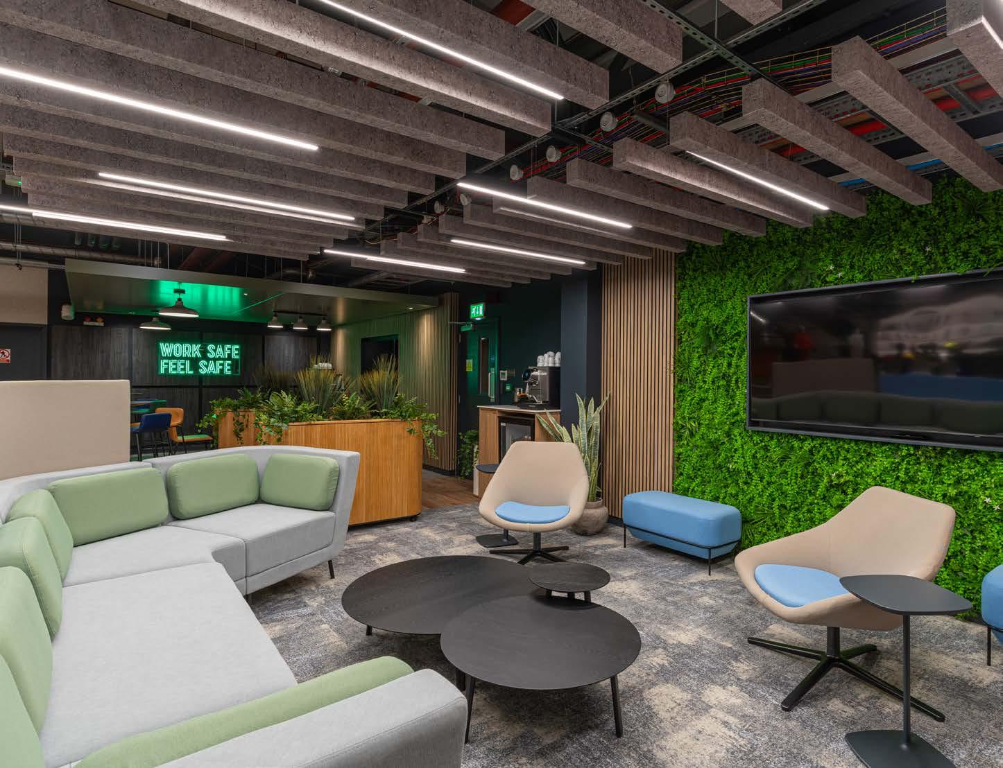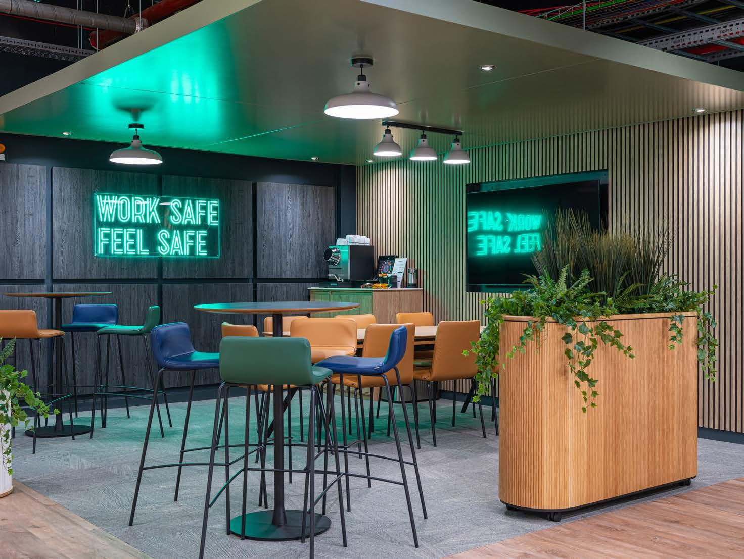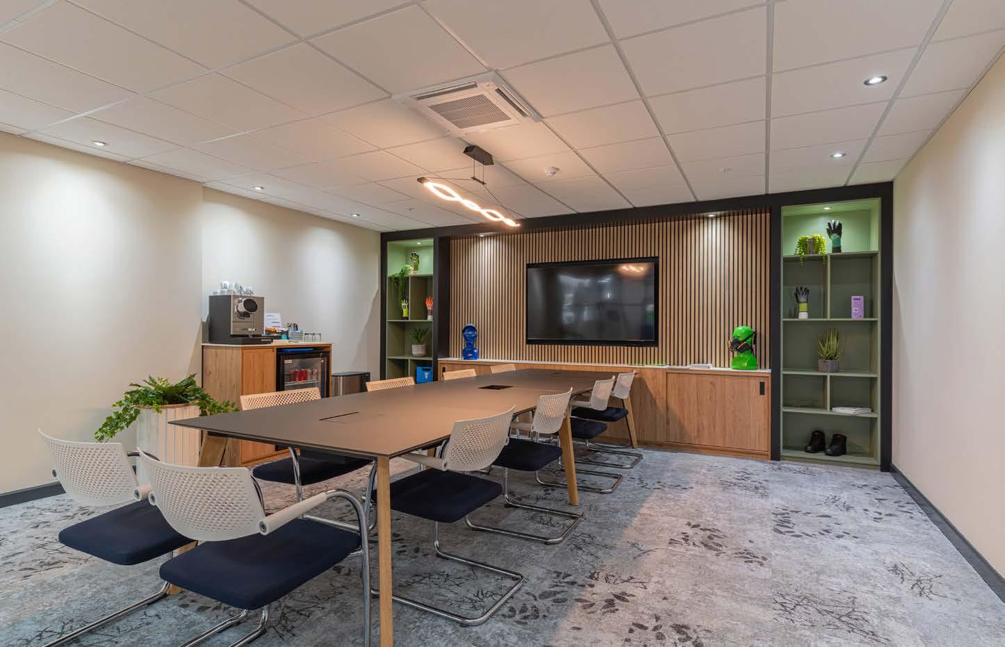 This innovative showroom features two bespoke break-out meeting areas, along with a formal conference room equipped with a media wall and large central table. Each space is uniquely designed with features like drink stations, faux greenery, and a green neon sign that boldly highlights Lyreco’s motto. The brightly lit showroom showcases modern, industrial-inspired display units with concrete finishes and metal clamp details, highlighting Lyreco’s products at varying heights, while the space’s thoughtful lighting and colour-blocked walls pull through their distinctive brand identity.
