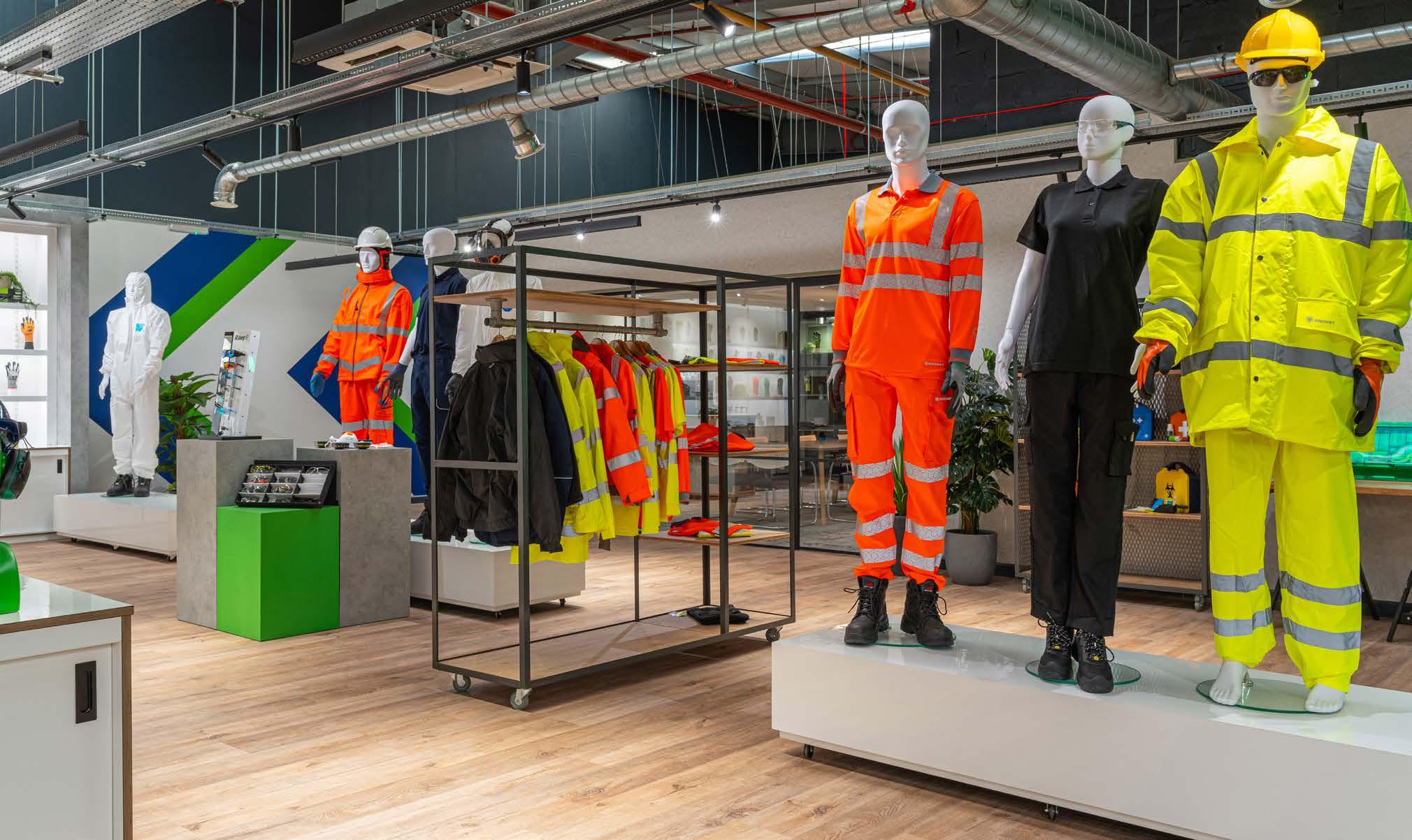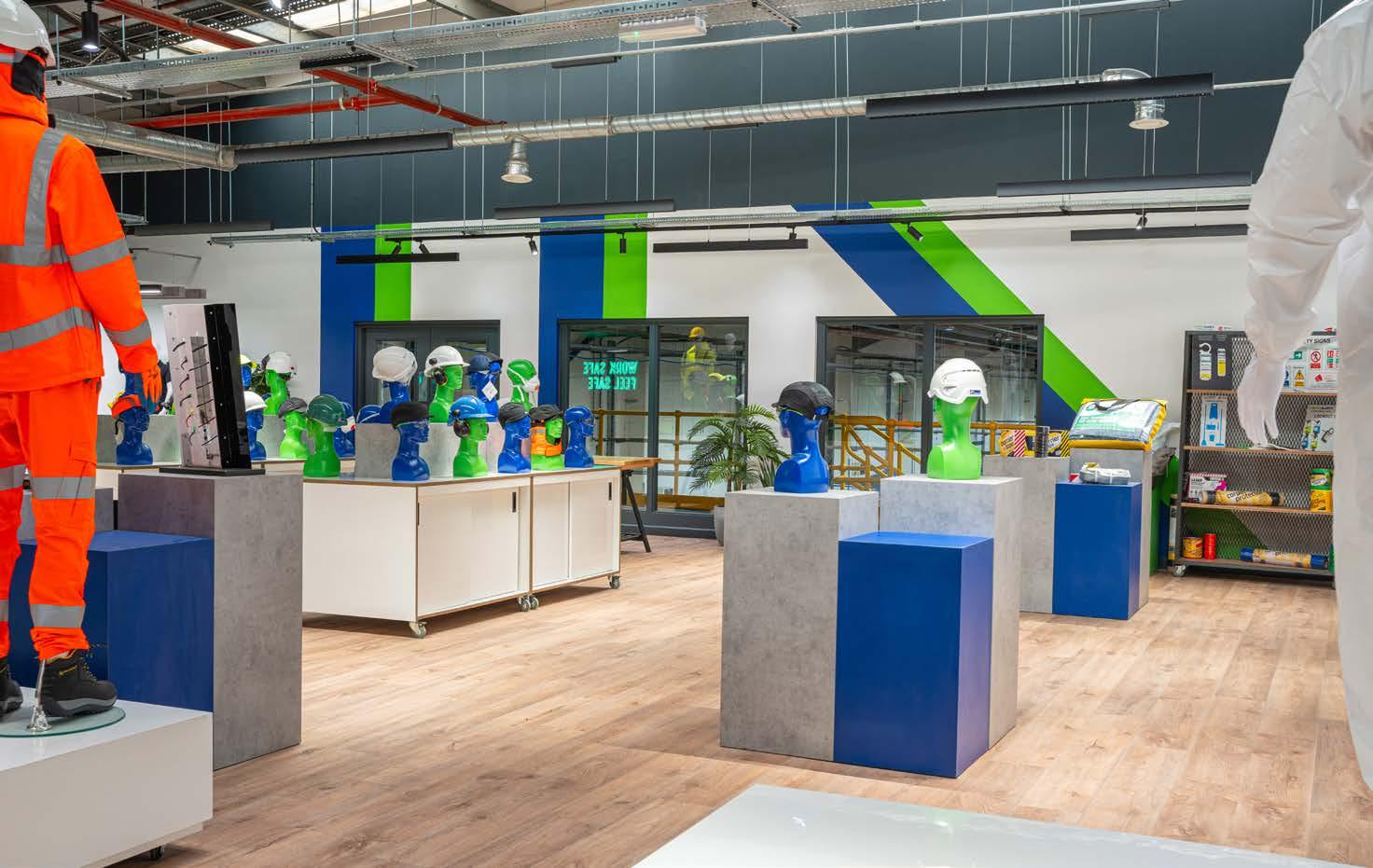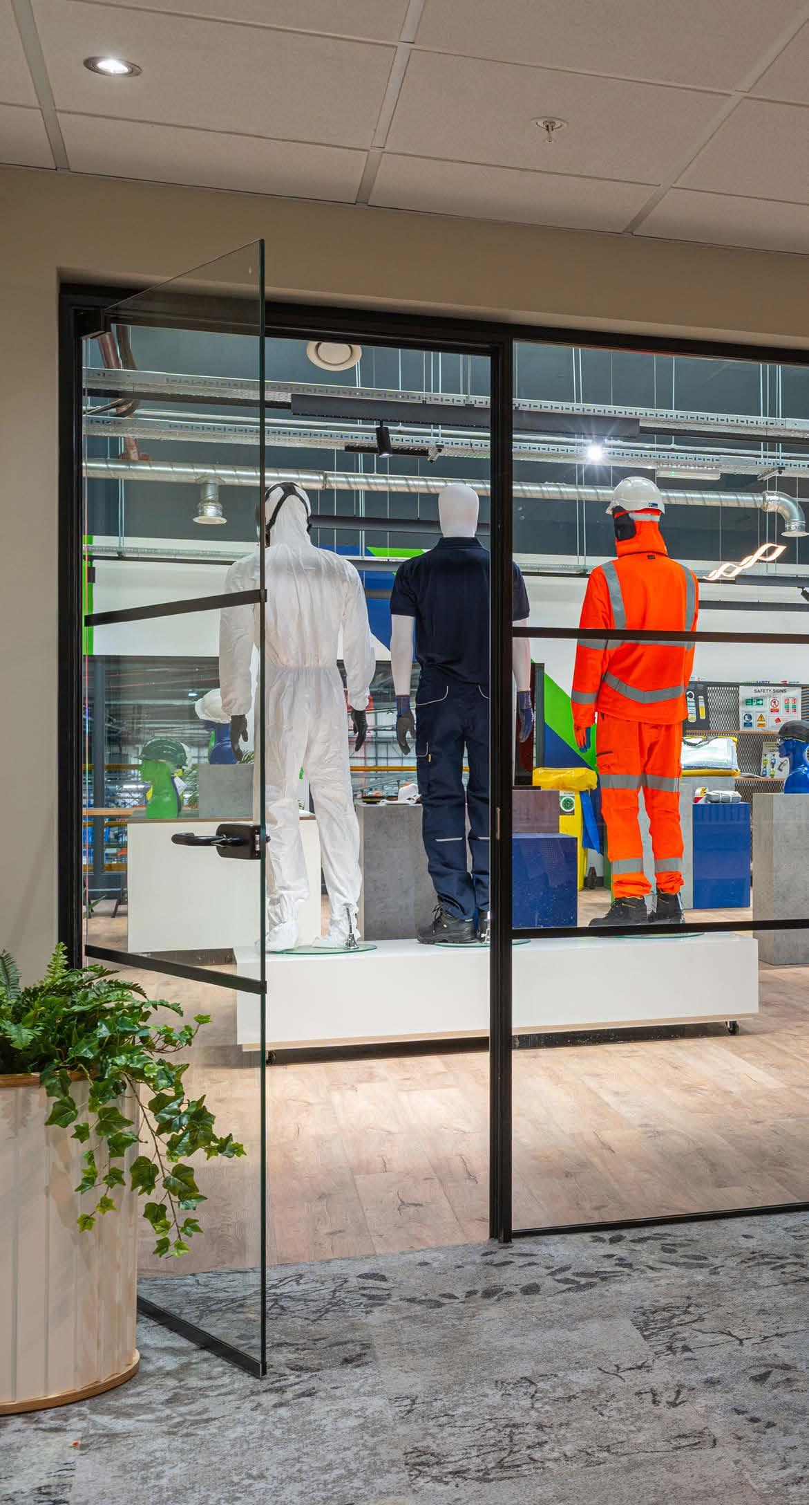 This innovative showroom features two bespoke break-out meeting areas, along with a formal conference room equipped with a media wall and large central table. Each space is uniquely designed with features like drink stations, faux greenery, and a green neon sign that boldly highlights Lyreco’s motto. The brightly lit showroom showcases modern, industrial-inspired display units with concrete finishes and metal clamp details, highlighting Lyreco’s products at varying heights, while the space’s thoughtful lighting and colour-blocked walls pull through their distinctive brand identity.