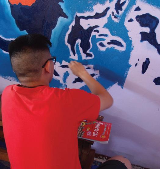 On the third day, we continued to work on our school build. Some of us worked on construction: placing planks and installing the windows and doors. Some others worked on repairing and repainting the chairs and tables. The others worked on painting the murals and we divided ourselves into two teams to paint in two different classrooms. One team painted the ocean with sea creatures and alphabet bubbles in the first classroom, while the other painted the world map with different continents and different species of animals living in that region in the second classroom.