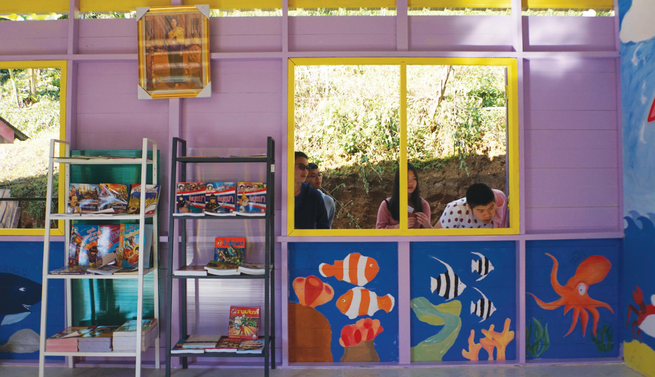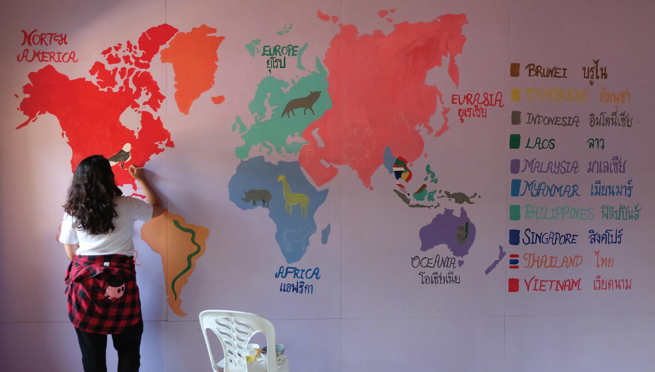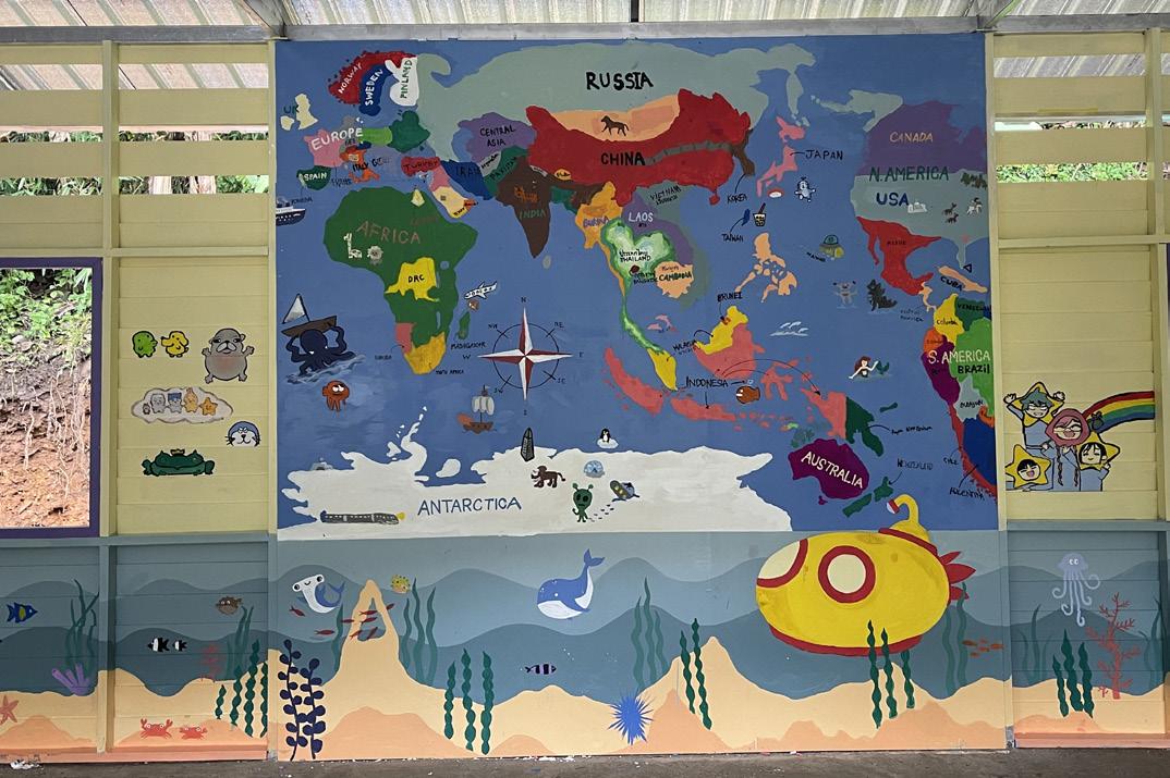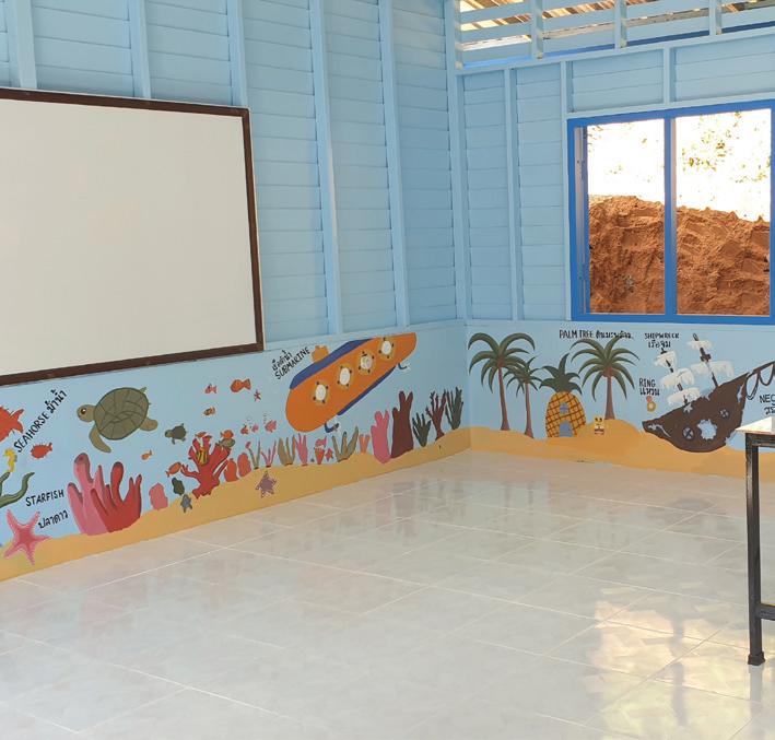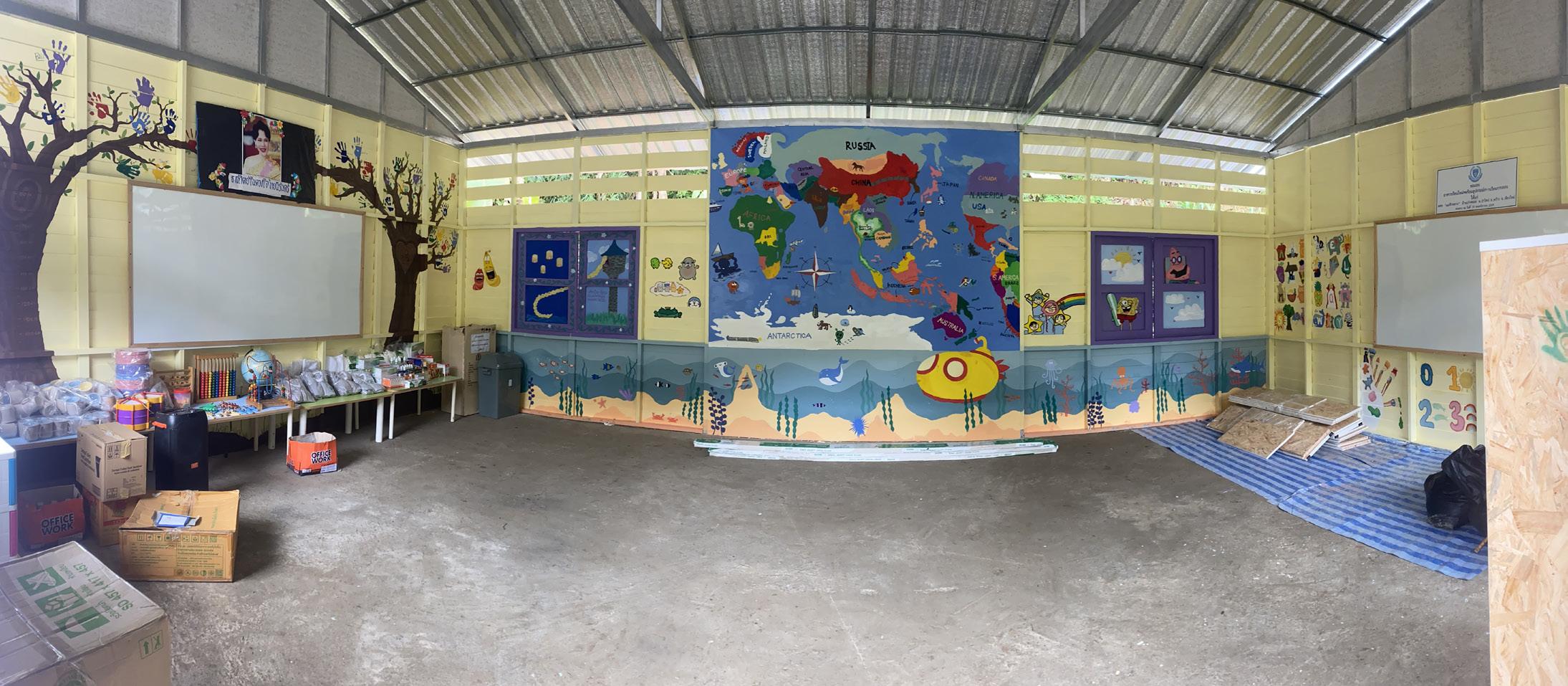 Over the course of five days, with paintbrushes and drills in hand, we diligently worked to fix the school, installing new walls and windows along the facilities and painting beautiful murals in the buildings. By the end of the trip, we had two beautifully decorated classrooms, a rainbow-painted canteen, and several beautiful murals featuring the bustling city of Bangkok, the galactic Solar System, the underwater world, and even a map of the World, complete with pictures of animals around the globe. We even created a small library, shelved with fantastic Thai books that the children will enjoy.