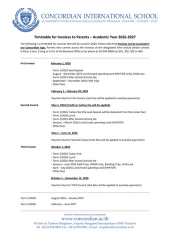 The following is a timetable for invoices that will be issued in 2026. Please note that invoices can be accessed in our Concordian App. Parents who cannot access the invoices at the designated time should please contact K.Alice, K.Jum, K.Jeng or K.Cin at the Business Office or by phone at 02-034-9000 ext.301, 302, 303 or 404.