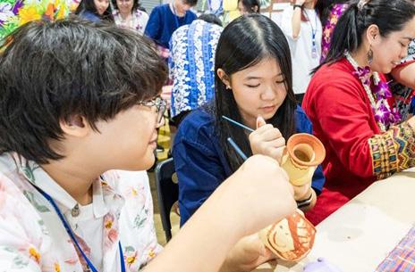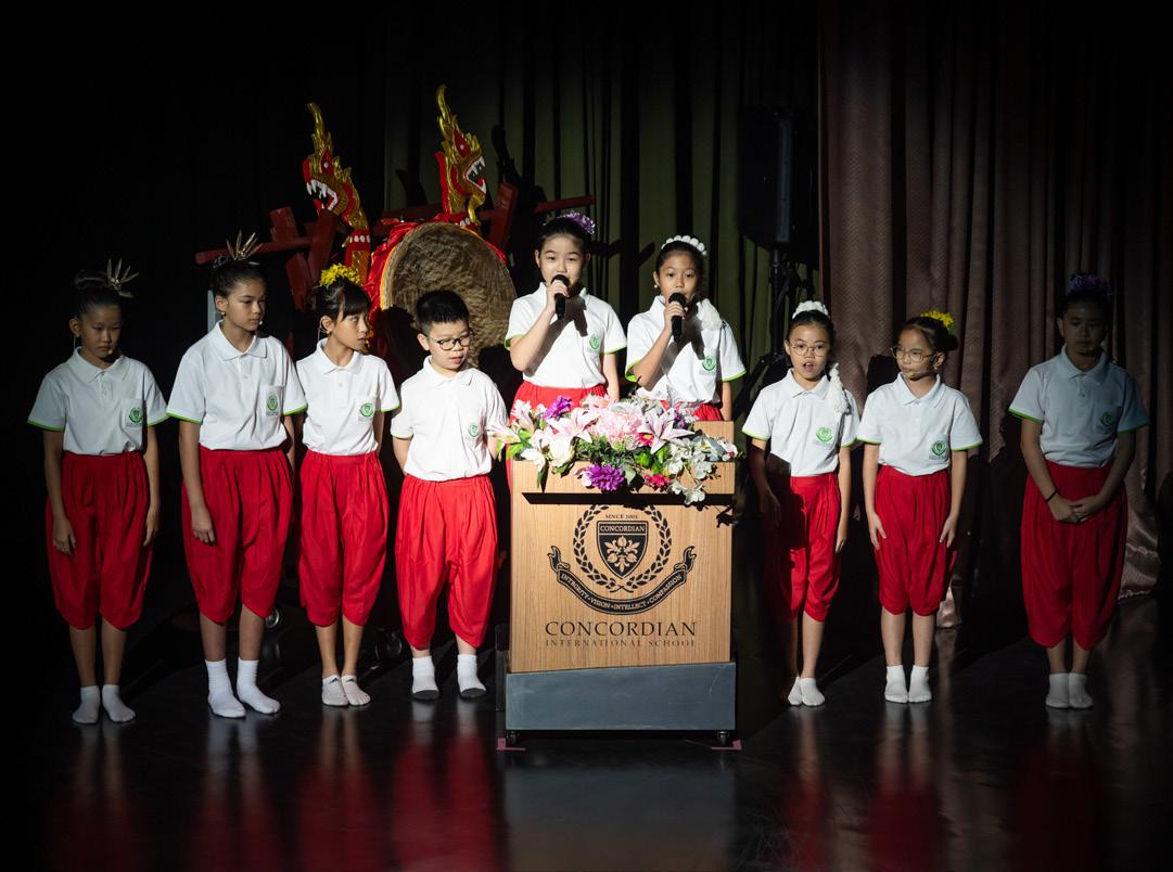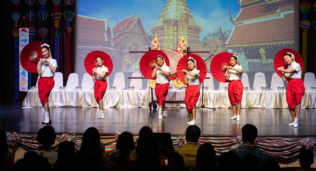 At the Grand Theater, before the wonderful pouring ceremony started, Grade 4 students took all PY students on a journey of Thai culture, performing the Dance of the Four Regions starting with the dance of Klong Sa-bat Chai as a symbol of peace and prosperity, the Umbrella Dance from North, the Mineral-Sifting Dance from South, the Dok Koon Dance from Northeast and The Long Drum dance from Central of Thailand.