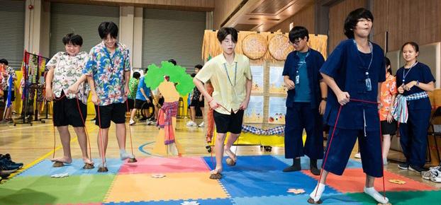 and selection of refreshing Thai herbal juice. In addition to Thai food and drinks, there are booths celebrating Thai traditional games and performances such as coconut-shell walking (เดินกะลา), where visitor balance their walks on coconutshell. “Lao Kratop Mai” (ลาวกระทบไม้), traditional lively thai folk song dance where visitors dance in harmony, promoting teamwork and collaborative skills and Wheel rolling (ตีวงล้อ), a traditional enjoyable Thai game.