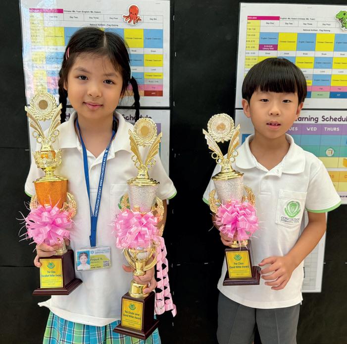 G3S Baipor: 这是我第一次在作 文比赛得奖!我非常兴奋。我 要谢谢爸爸妈妈让我在这个学 校学习。我觉得这一次比赛我 认真复习汉字了,也用了很多 超级词语。谢谢老师!I am very excited to win the writing contest for the 1st time. I thank my parents for letting me study at Concordian. I worked hard on reviewing the Chinese characters before the contest and used many juicy words. Also, I want to thank my teachers.