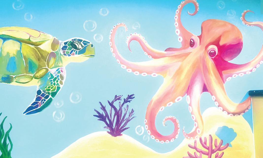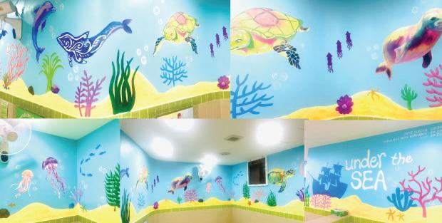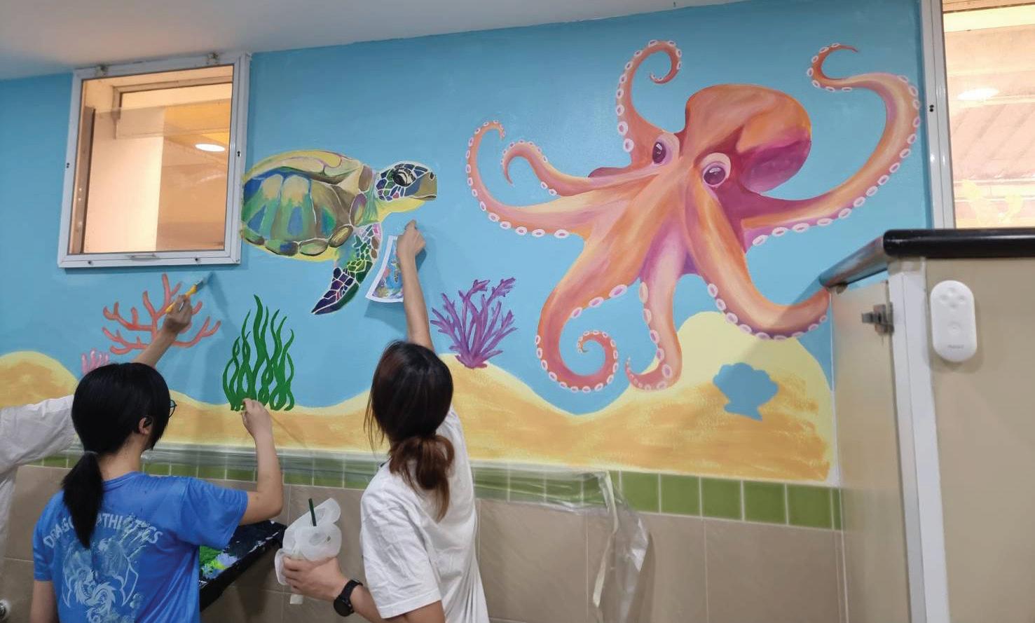 We wanted to design something that would capture their attention and imagination, using bright colors and playful elements such as coral reefs, fish, and other marine animals. Throughout the process, we worked together to plan the placement of each animal and divide responsibilities, from sketching the initial outlines to painting detailed sections.