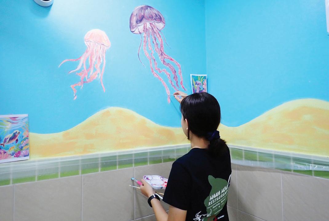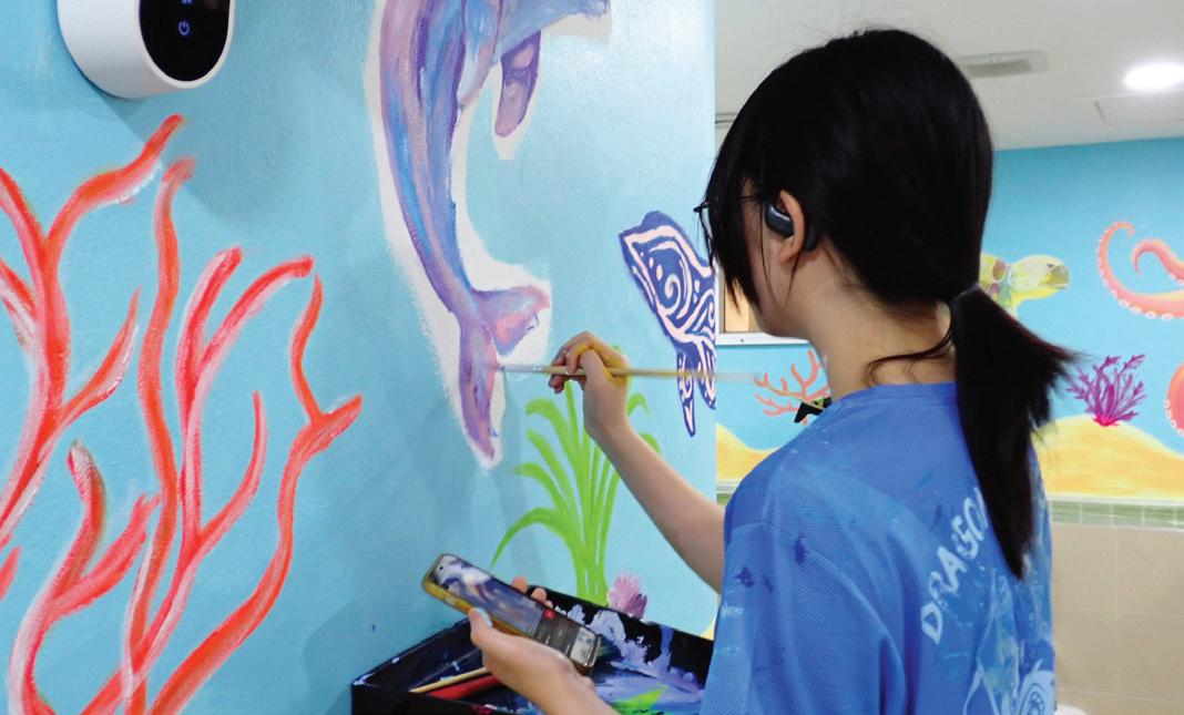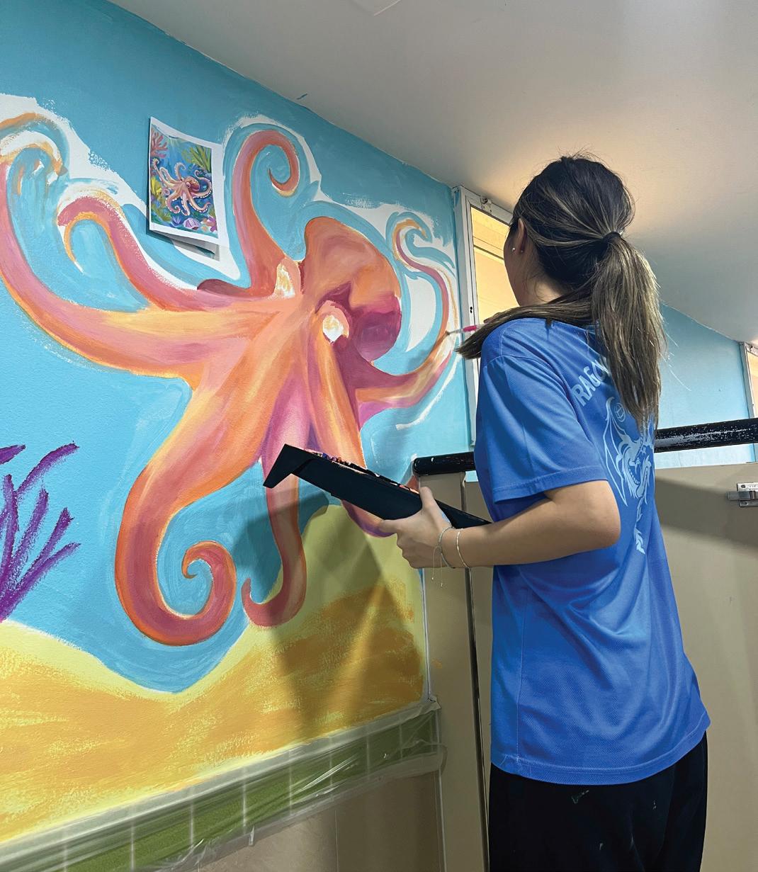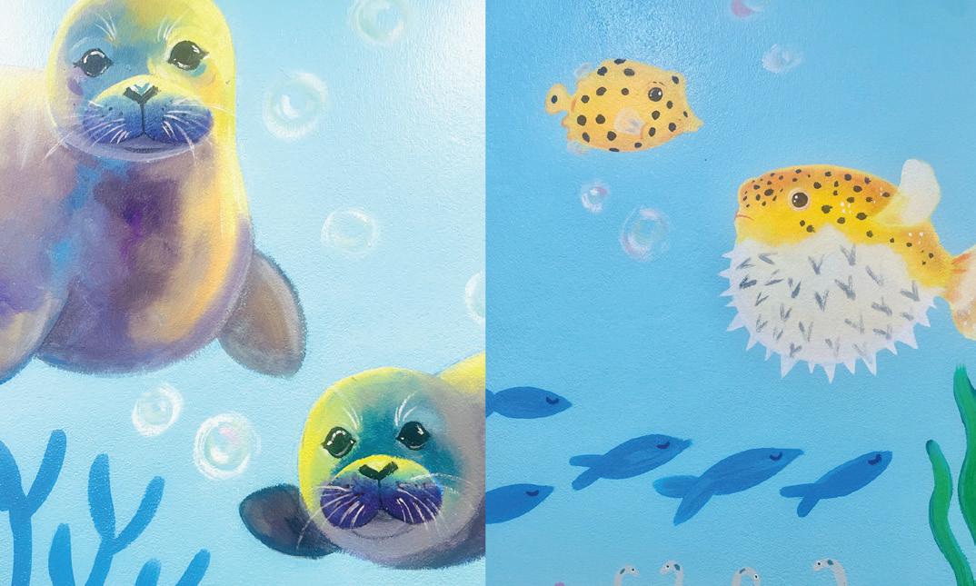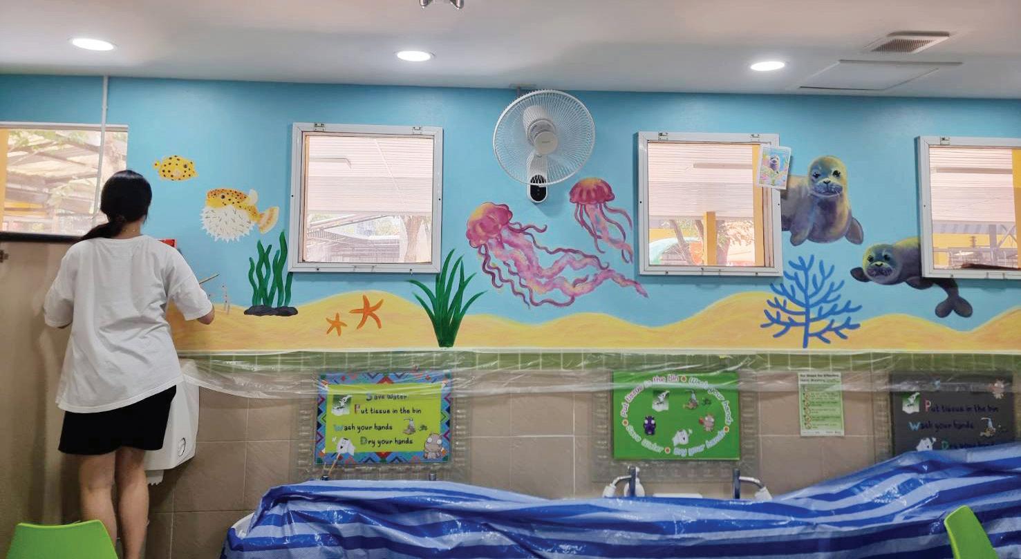 We wanted to design something that would capture their attention and imagination, using bright colors and playful elements such as coral reefs, fish, and other marine animals. Throughout the process, we worked together to plan the placement of each animal and divide responsibilities, from sketching the initial outlines to painting detailed sections.