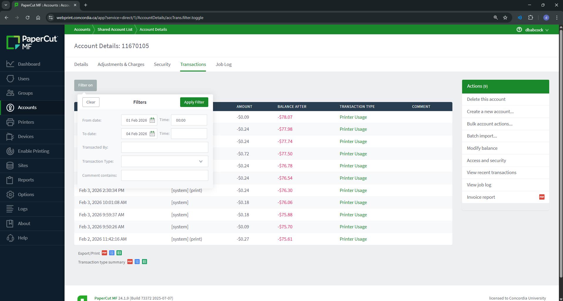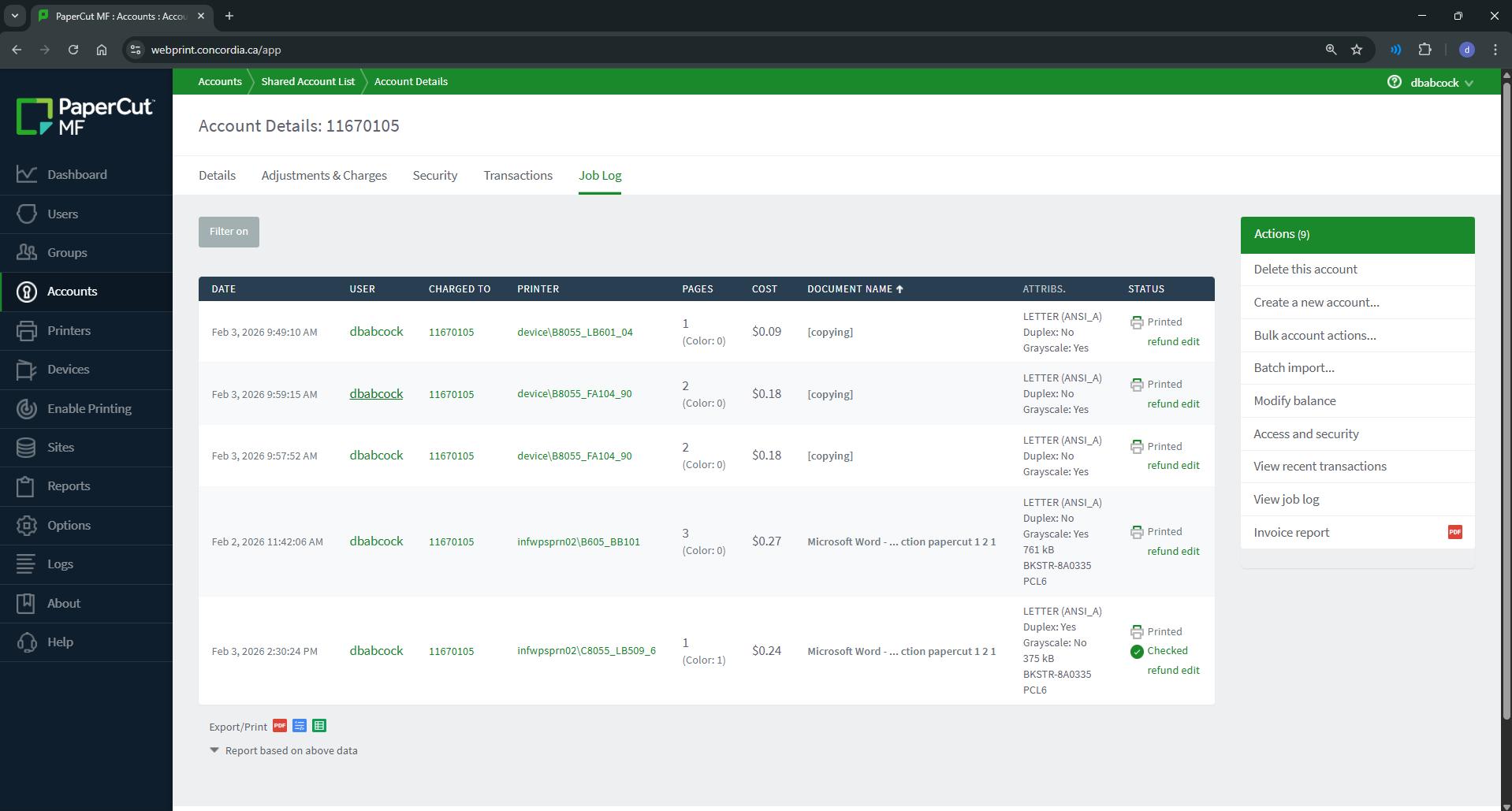 Finally, by selecting “Job Log” in the top menu bar, you will be able to see all jobs sent using the shared account. This includes the who, what, when, and where. As with Transactions, you can set the date range and export reports.