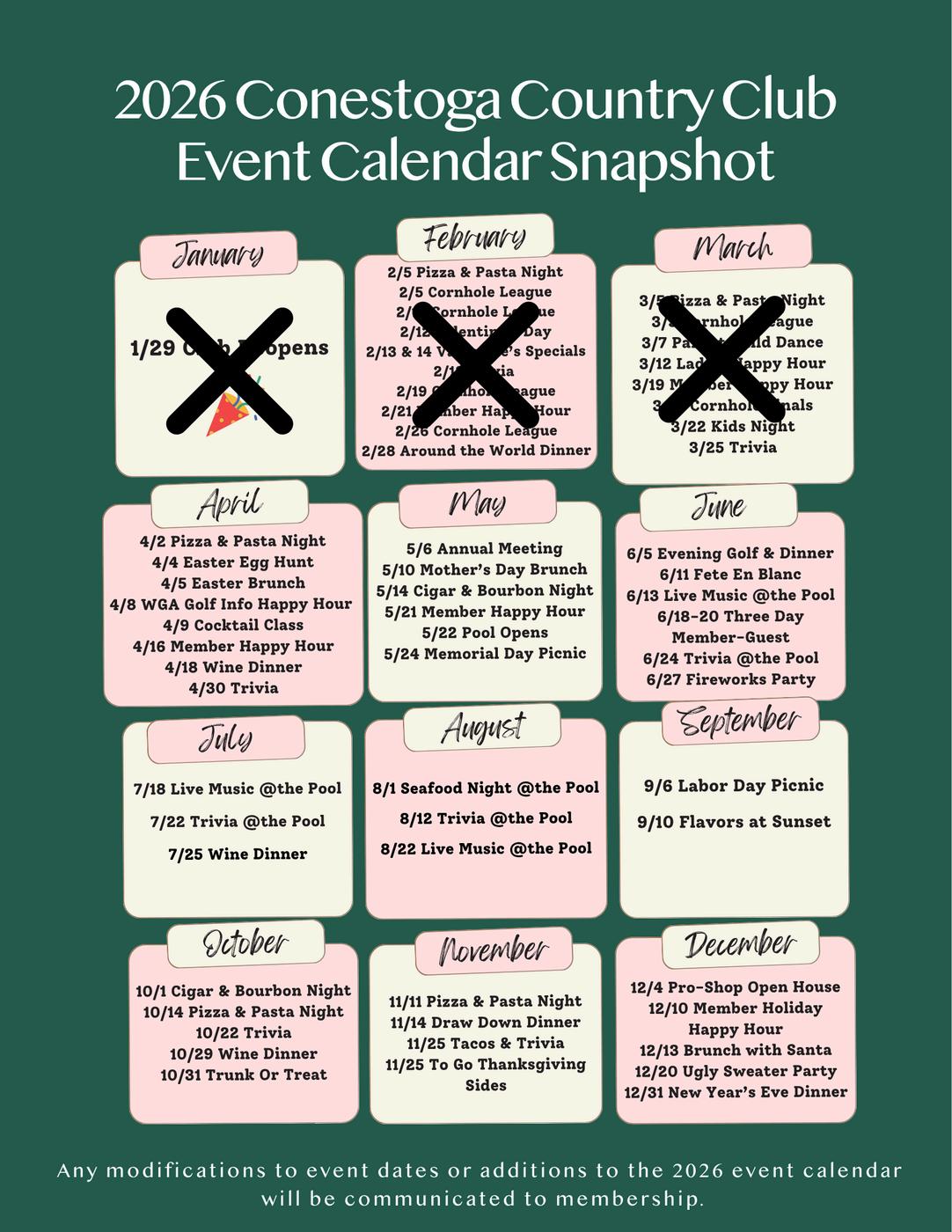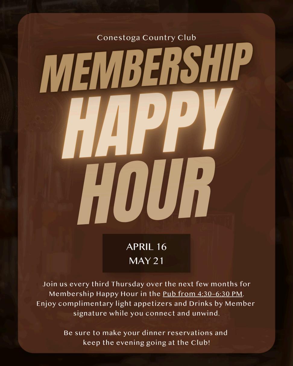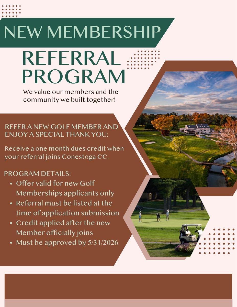 As we head into the season, I also want to highlight our new member referral program. Our members are our greatest resource when it comes to welcoming new families to the club. The sense of community here at Conestoga is what makes this place so special If you have friends, family, neighbors, or colleagues who would enjoy the club, I encourage you to invite them to experience it firsthand. As a thank you, any member who refers a new golf member will receive one month of complimentary dues. There is no better way to grow our community than through the relationships that already exist within it.