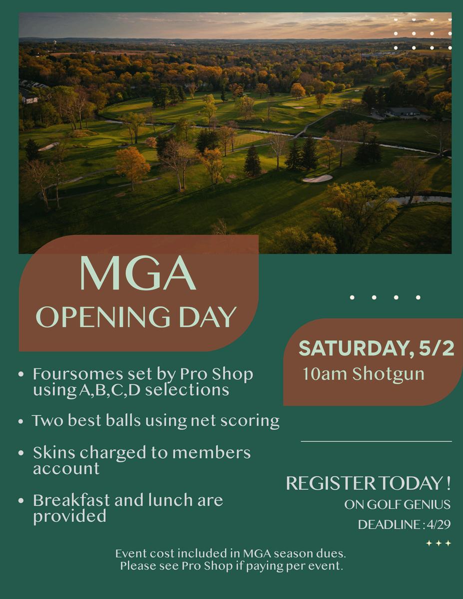 This year’s MGA Tournament dues will be $215 and may be paid by check made payable to CCC MGA. Mail to CCC MGA /Robert Leeman at 1950 Stone Mill Road Lancaster, PA 17603 or drop off in the Pro Shop. MGA Dues MUST be paid prior to Opening Day; Members can elect to play in a single MGA event with a charge of $70 if they are not MGA Members.