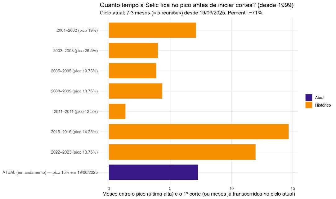 Quanto tempo a Selic fica no pico antes de iniciar cortes? (desde 1999) Ciclo atual: 7.3 meses (≈ 5 reuniões) desde 19/06/2025. Percentil ~ 71%