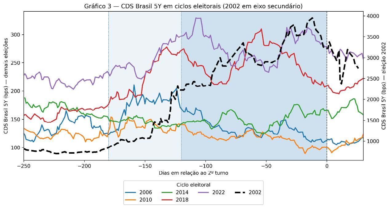 A eleição de 2002 se destaca como um caso à parte e, por isso, é representada em um eixo secundário no gráfico. A trajetória do CDS naquele ciclo evidencia um aumento acentuado e persistente do prêmio de risco ao longo de todo o período pré-eleitoral, refletindo um ambiente de elevada incerteza quanto à sustentabilidade do regime macroeconômico e à condução futura da política econômica. A separação visual permite identificar com maior clareza o padrão dos demais pleitos, nos quais a reação do CDS é mais suave e concentrada no curto prazo, reforçando a distinção entre episódios de incerteza transitória e choques associados a possíveis mudanças de regime.