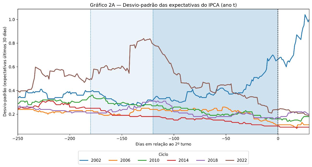 Os Gráficos 2A e 2B permitem observar essa dinâmica ao analisar a evolução do desvio-padrão das expectativas para o Índice Nacional de Preços ao Consumidor Amplo (IPCA) em torno do segundo turno, distinguindo entre o ano corrente (t) e o ano seguinte (t+1). No horizonte do ano t, a dispersão das expectativas aumenta de forma relativamente consistente entre os ciclos eleitorais à medida que o pleito se aproxima, sinalizando uma elevação da incerteza de curto prazo. No horizonte do ano seguinte, o comportamento é mais heterogêneo: em eleições consideradas mais previsíveis, a dispersão tende a permanecer relativamente estável, enquanto, em episódios de elevada incerteza, como em 2002, observa-se uma ampliação significativa também para horizontes mais longos.