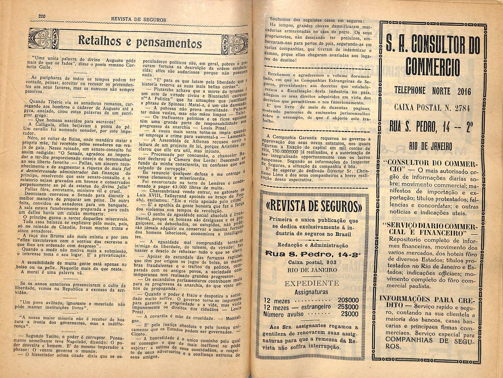 0 seguro no Brasil esta desviado do seu fim louvavel e honesto. Elie nao d um institute de previdenc.a para garantir a fortuna particular contra cases fortuitos ou de forga maior, mas um estimulante de crimes, para os quaes concorrem os agencLadores de seguros, convldando os commer-