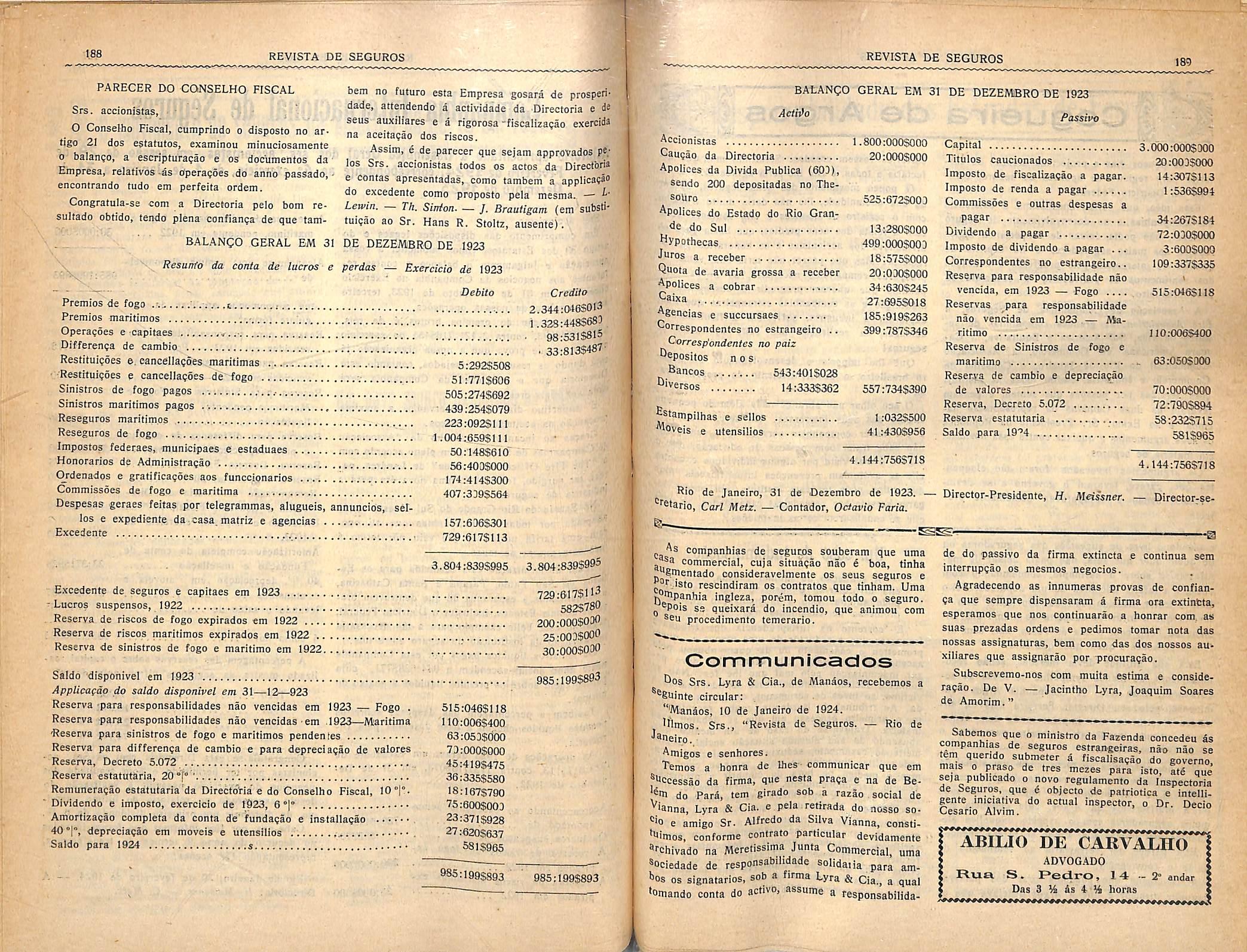 Insere.tambem,"Seguros y Bancos", traduzido em hespanhol,o artigo, —"O seguro e o Estado" Seguradores e Segurados", • que pubiicamos no numero de Outubro ultimo, com a assignatura do nosso Director, que e gentilmente qualificado oomo "distinctissimo advogado brasileiro, periodista de fecunda actuaqao, que se especialisou em uma e ou'tra cousa, dedicando-se ao estudo do seguro ein seus diversos aspectos, e possuindo, como escriptor, um estylo claro, conciso e energico, que lievela um "temperamento estudioso e investigador".