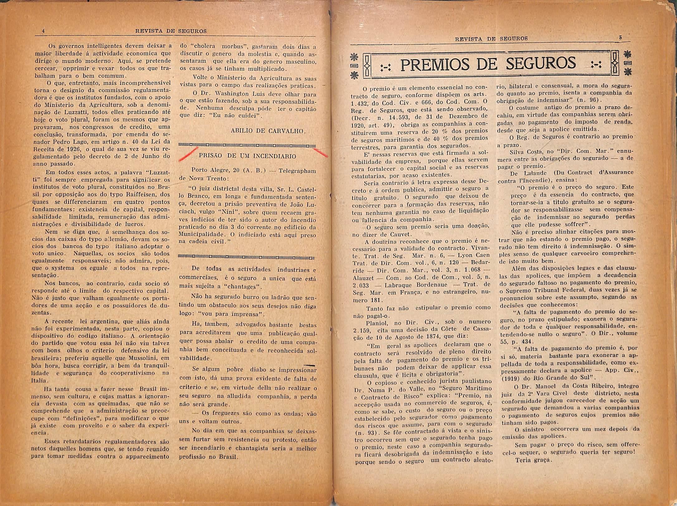 "O premio e o prego do seguro. Estc pi'.ego e da esseiicia do contracto, que tornar-se-ia a tituio gratuito se o segura dor se responsabilizasse sem corapensa?ao dc indemnisar ao segurado perdas que ellc pudesse soffrer".