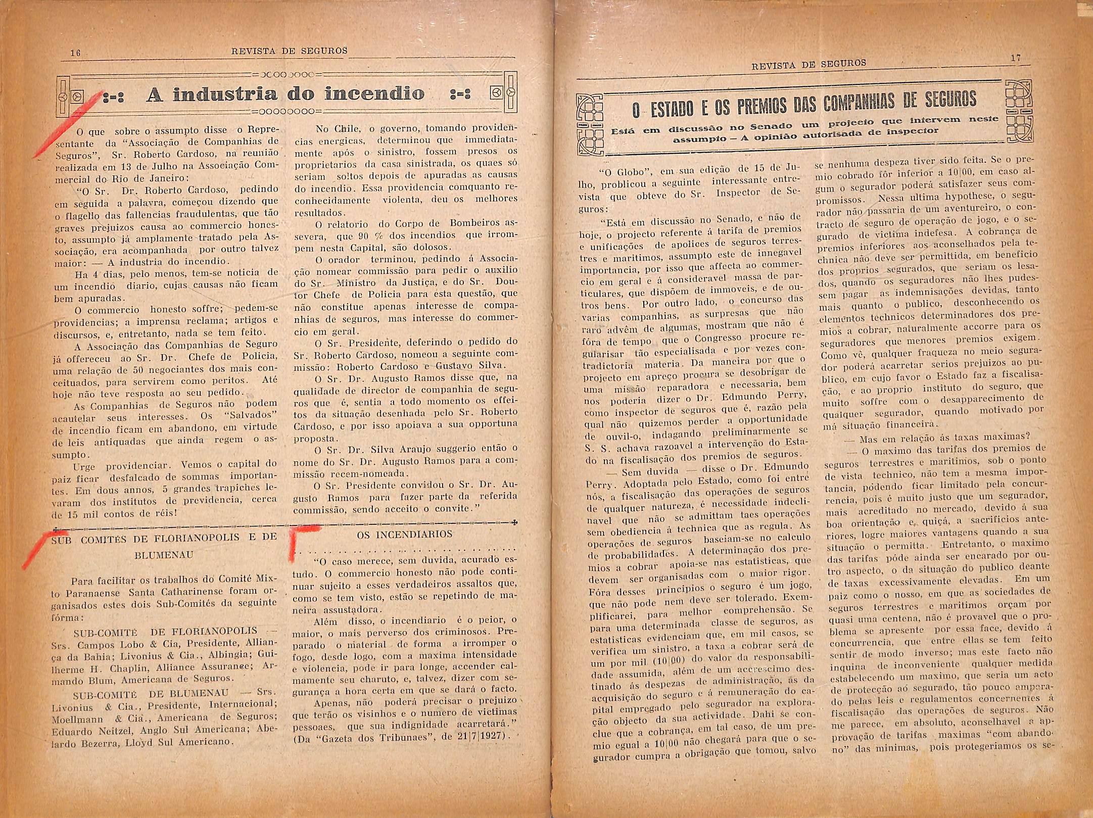 A proposilo il(! urn projccto rciativo as taxas niinimas cle premios l' a aclopfao de um typo iinico de apolices de segiiro, dois illustros senadores fizeram injustas censuras a Jnspectoria de Seguros.
