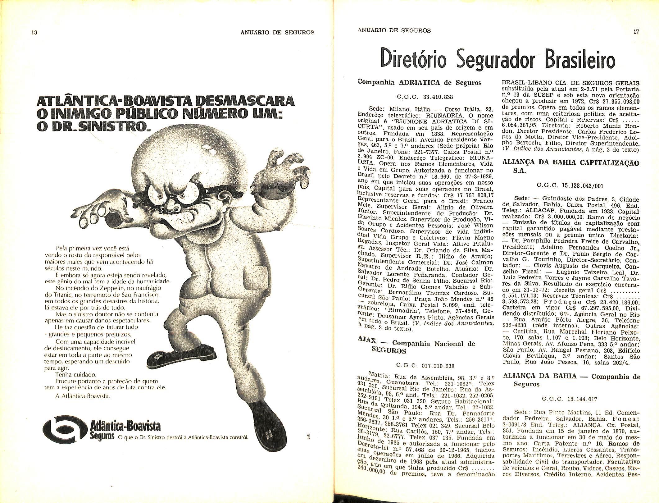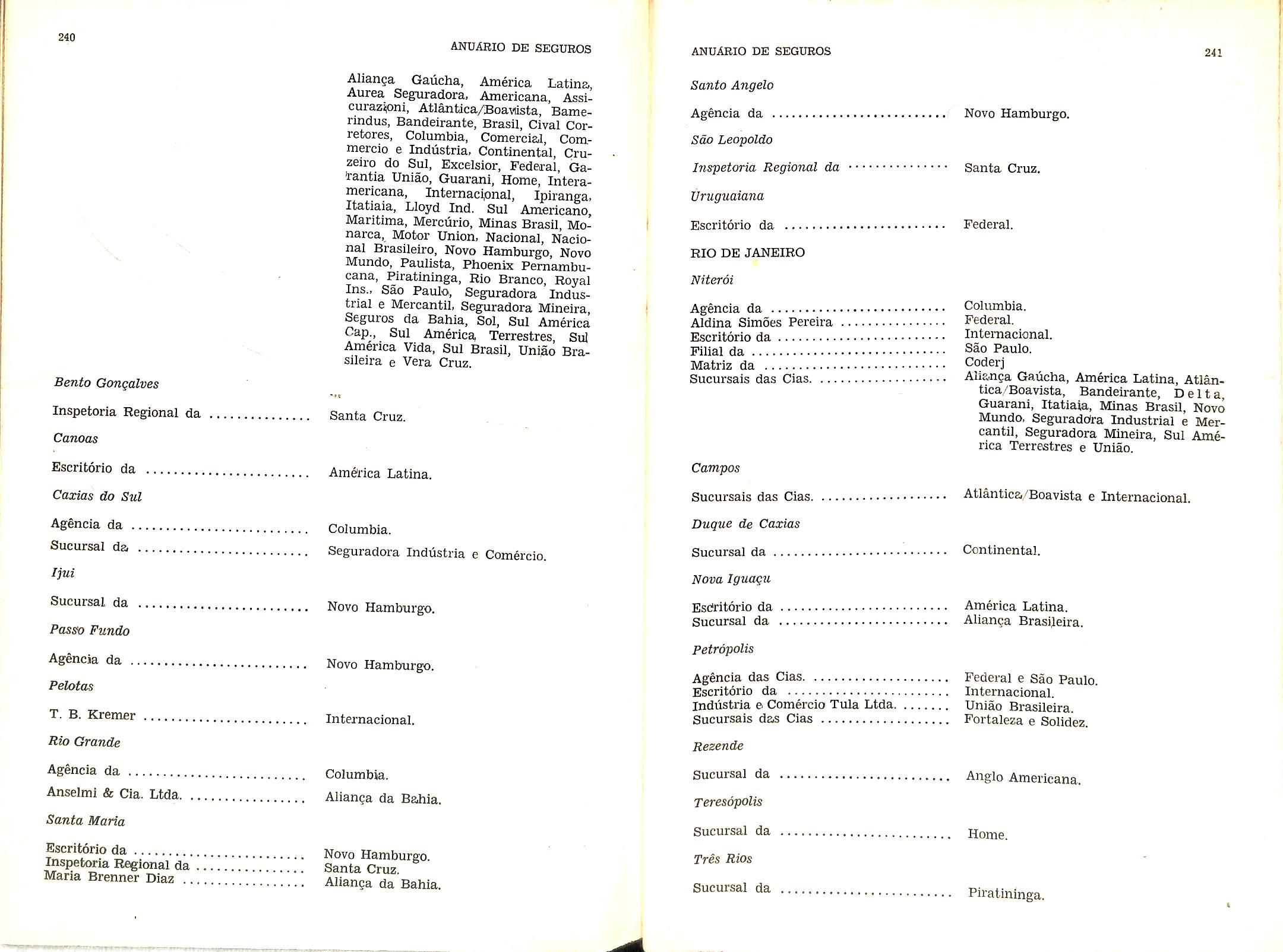 Sucursais das Cias Adridtica, Ajax Corretores, Ajax Segs,. Alianca da Bahia, Alianga Brasileira, Alianca Gaiicha, Alvorada, America na, Argos Fluminense, Assicurazioni, Assurances Generales, Atlantica/Boavista, Bamerindus, Brasil, Catarinen se, Columbia, Comercial. Commercio e Industria, Oooifiaiiga, Continental, Delta, Federal, Fortaleza, Excelsior, Garantia Uniao, Guarani, Home, Inconfidencia, Independcncia, Ins. North America. Interamericana, In temacional, Itatiaia, Liverpool & Lon don & Globa, Lloyd Ind. Sul America.no, Merciirio, Minas Brasil, Monarca, Motor Un'on, Nacional. Nacional Bra sileiro, Novo Hamburgo, Novo Mundo. Phenix de Porto Alegre, Phoenix Bra-